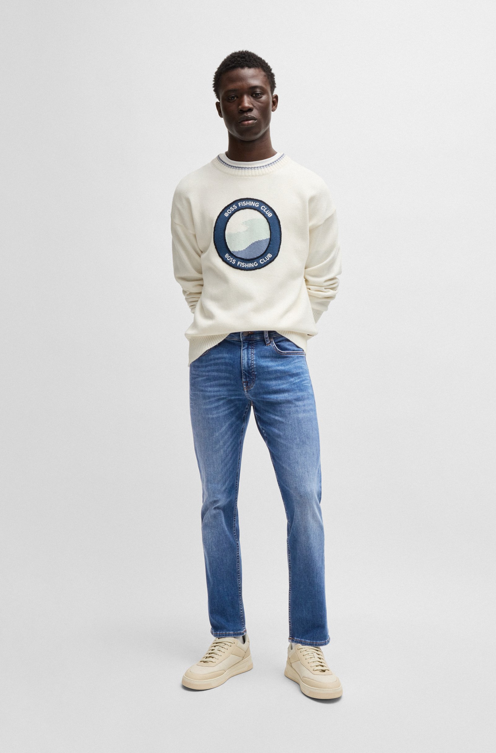 With slub yarn for modern character, these BOSS Menswear jeans have a fresh blue tone. Slim cut with added stretch for ease of motion. This product’s raw material is derived from regenerative agriculture: an approach focused on preservation and restoration that aims to increase biodiversity, preserve water quality and improve soil health while absorbing CO2. Regenerative agriculture also promotes animal welfare and fair working conditions for farmers.