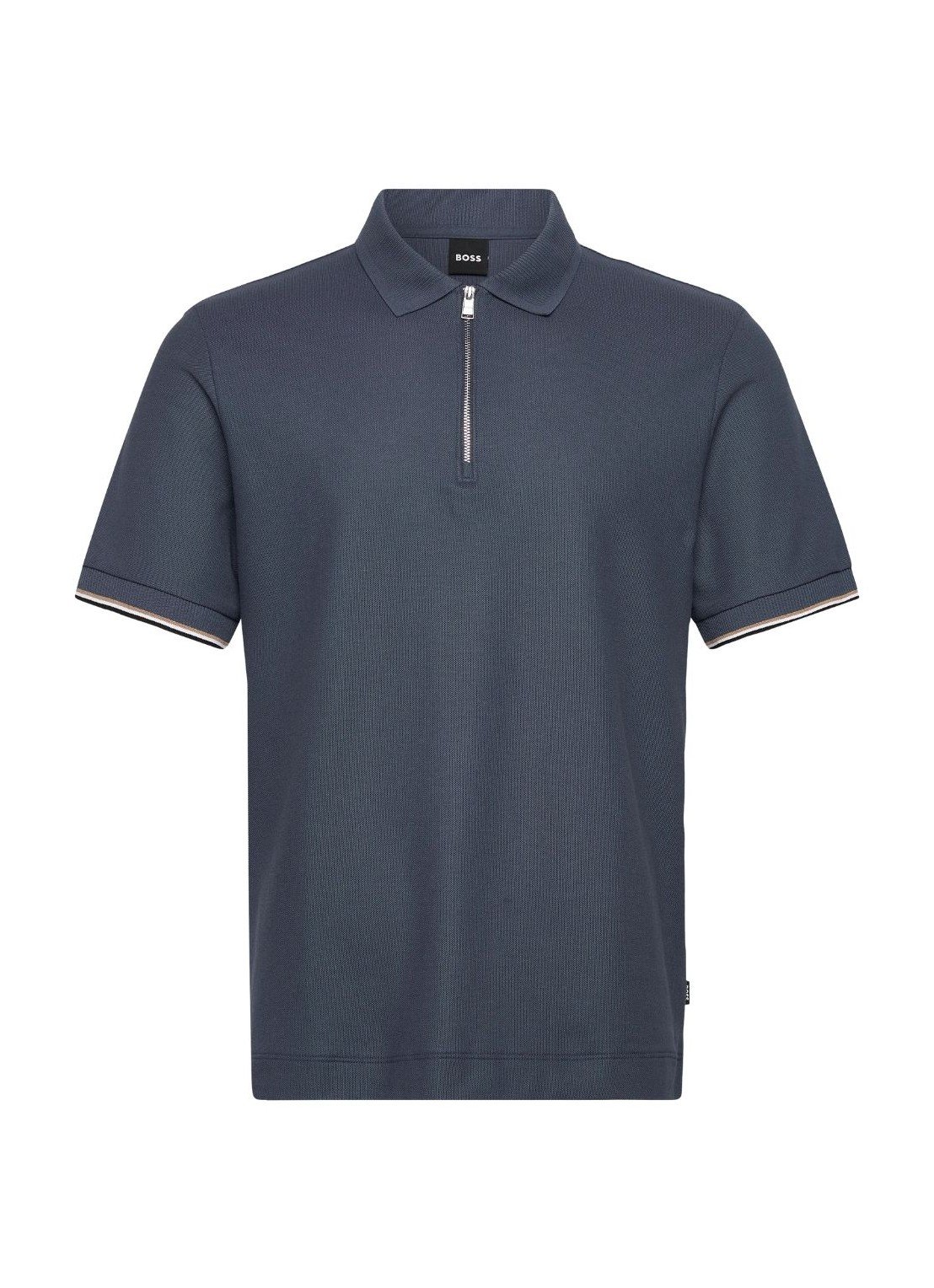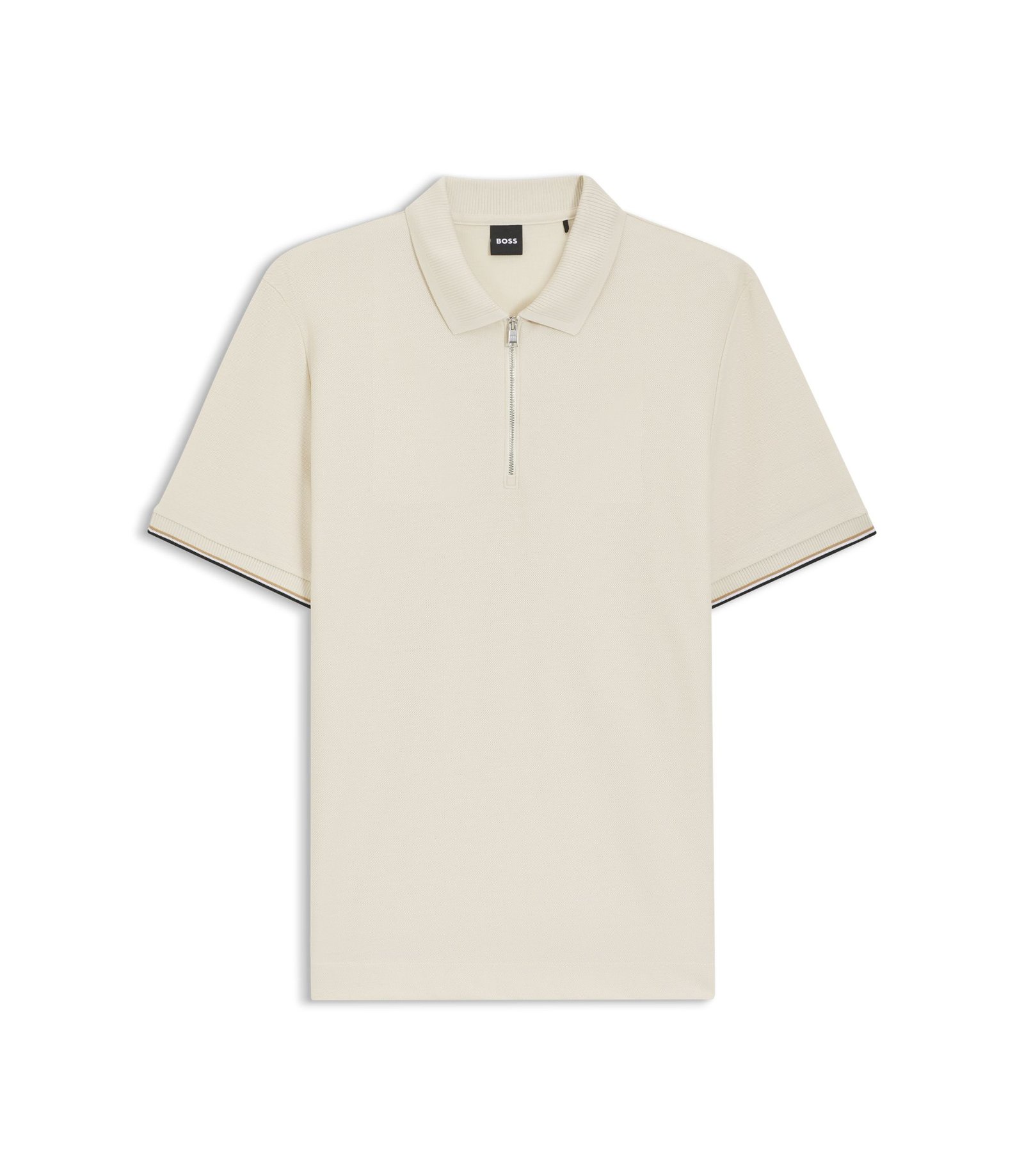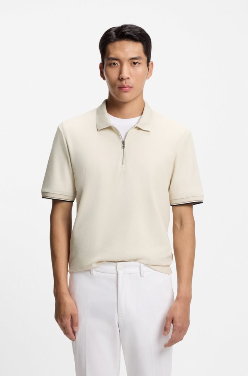 A sporty essential, this zip-neck BOSS Menswear polo shirt is crafted in soft cotton with a honeycomb piqué weave. Signature-stripe cuffs. Straight fit.