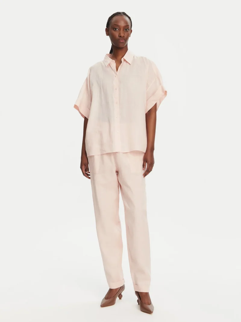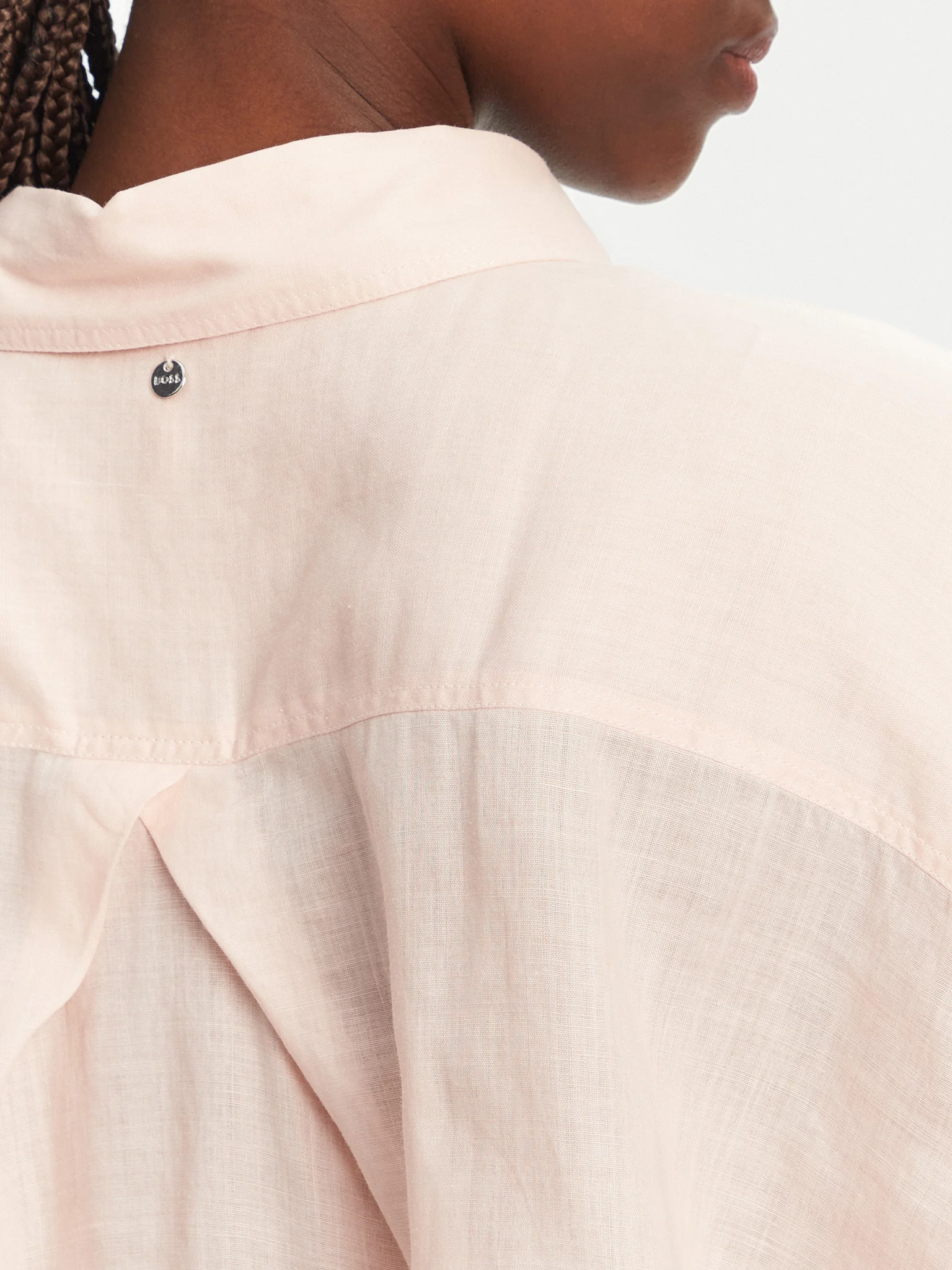 With a subtle embroidered logo, this BOSS Womenswear blouse is a great summer option. Drapey, soft fabric with a loose fit and rear cross pleat.