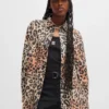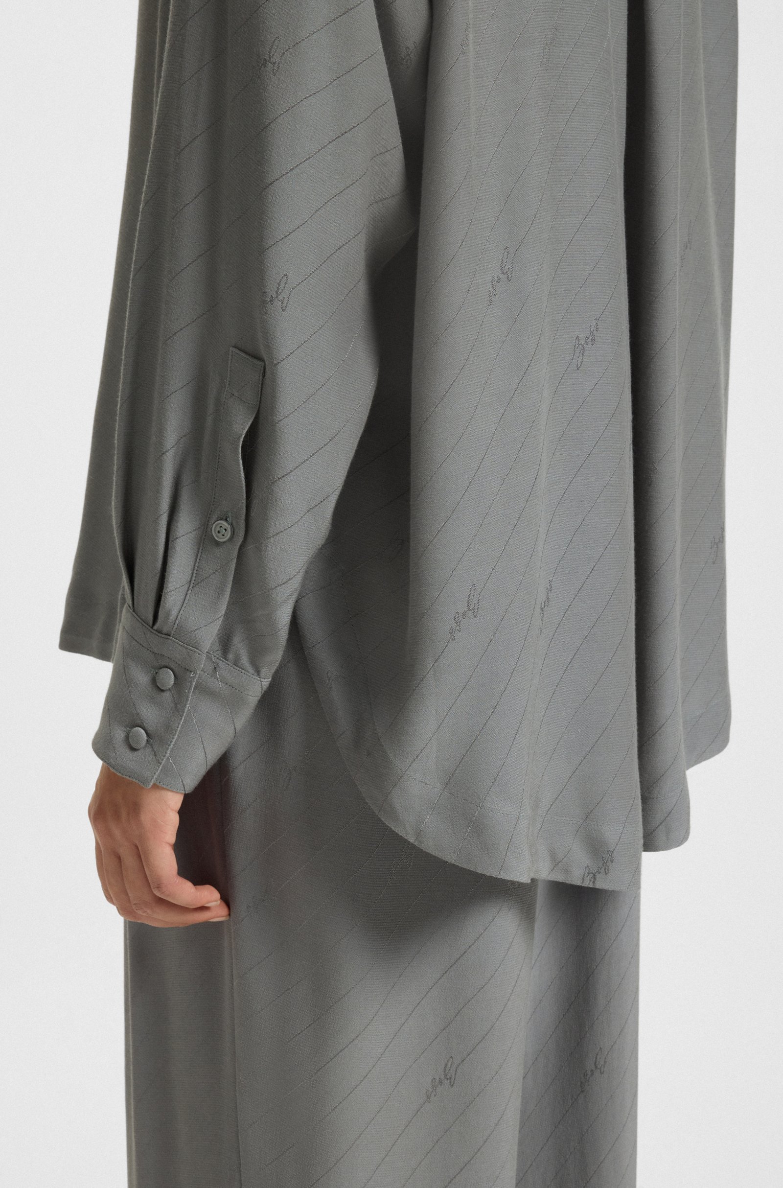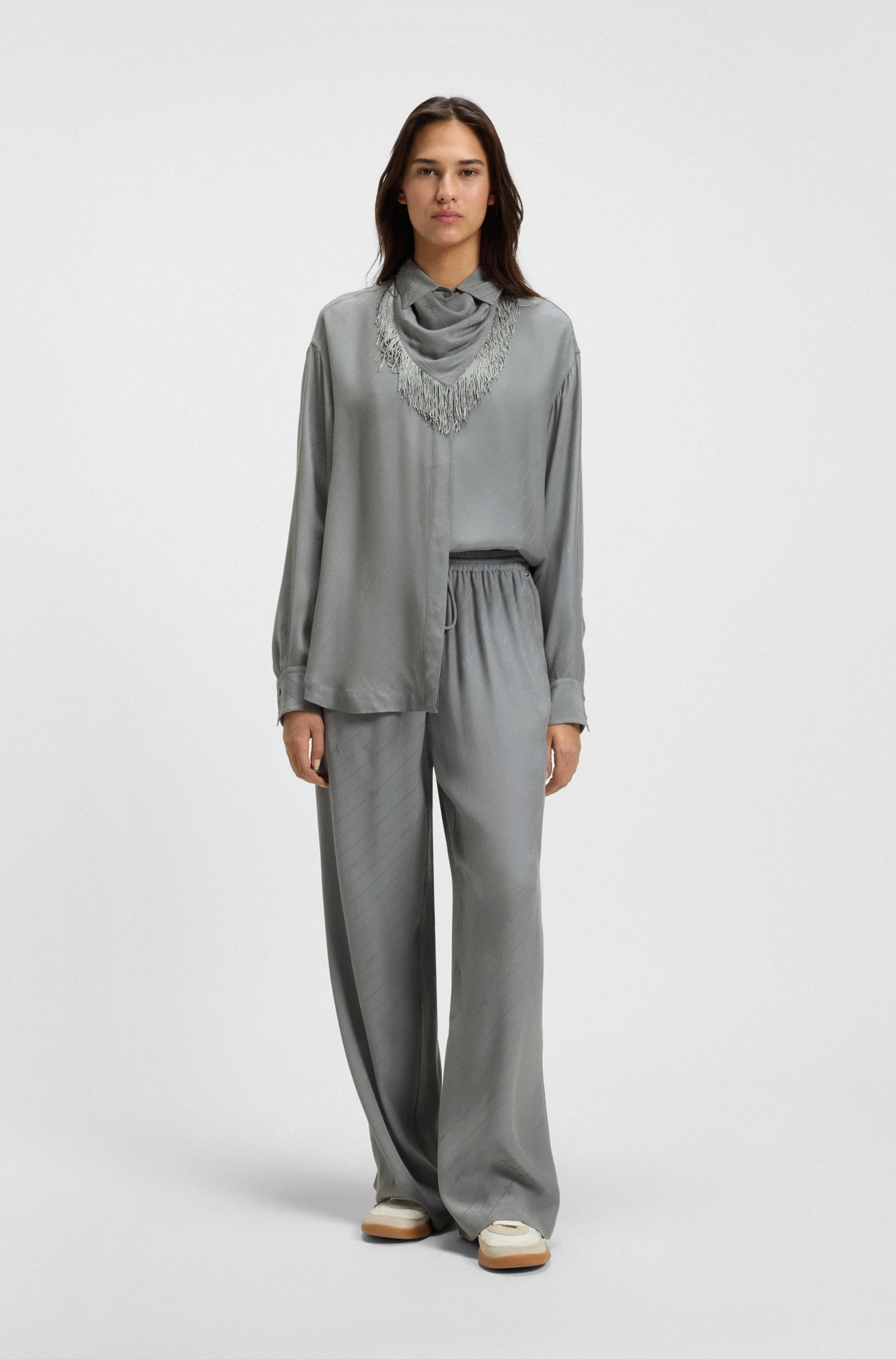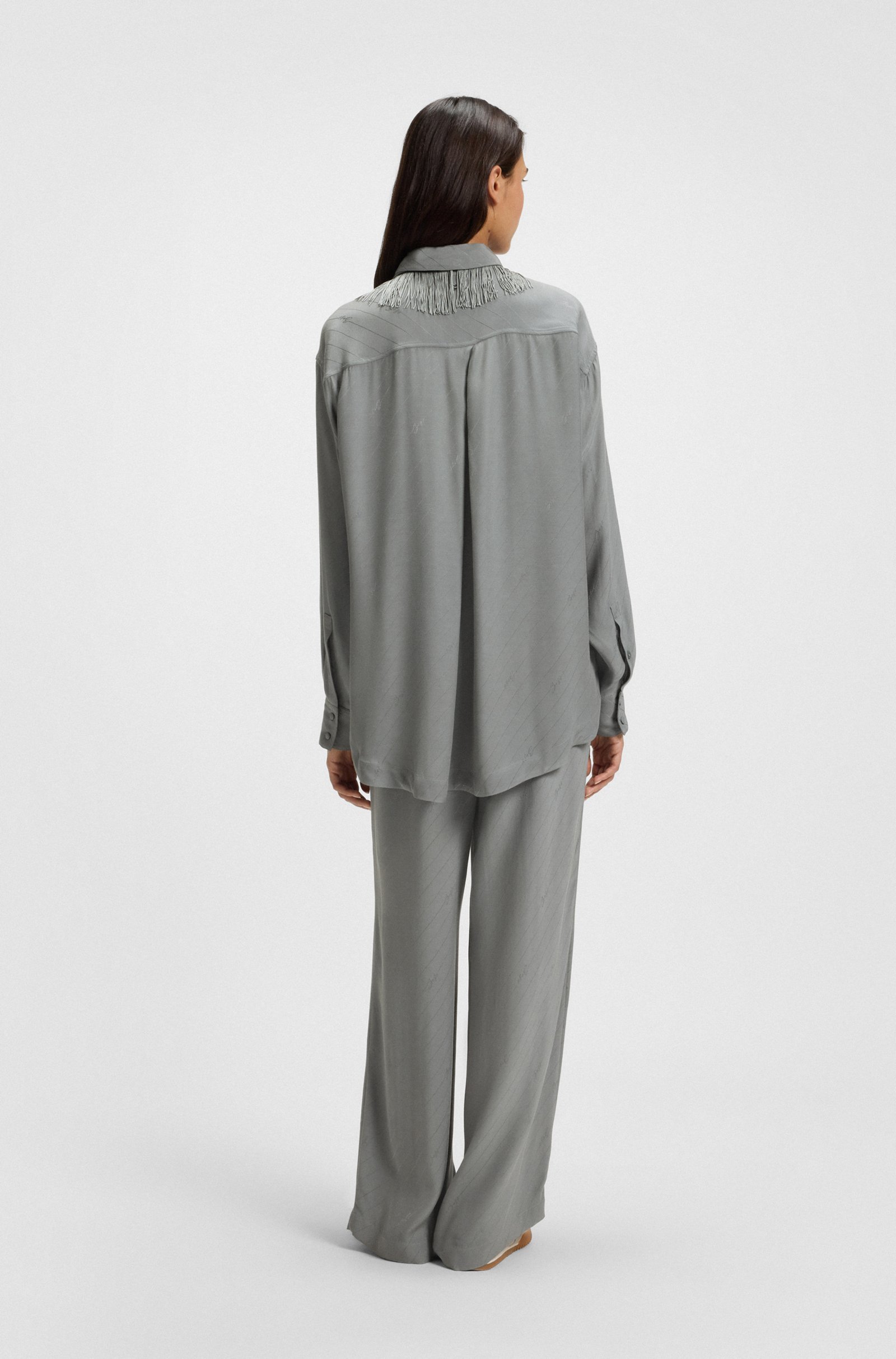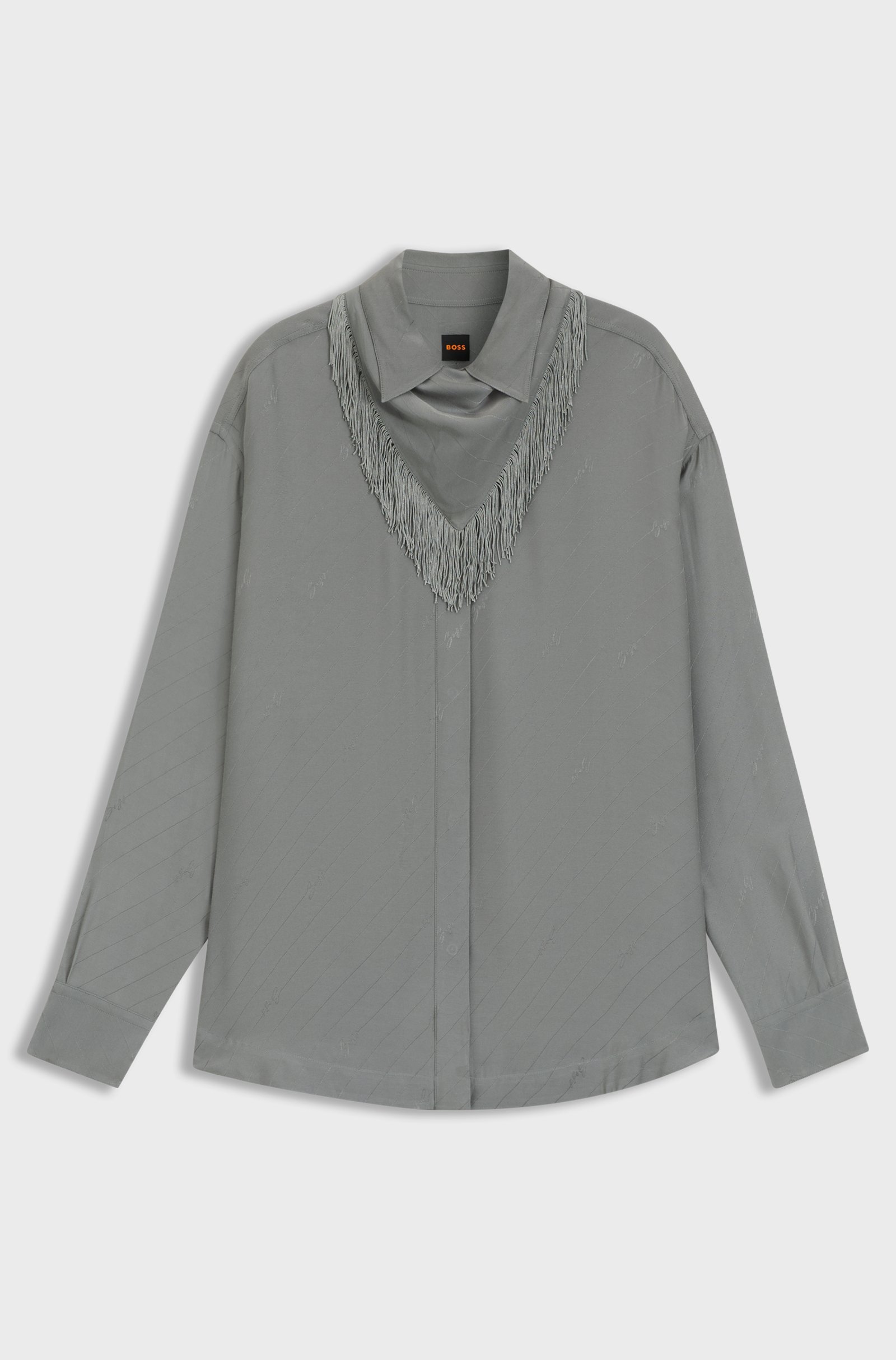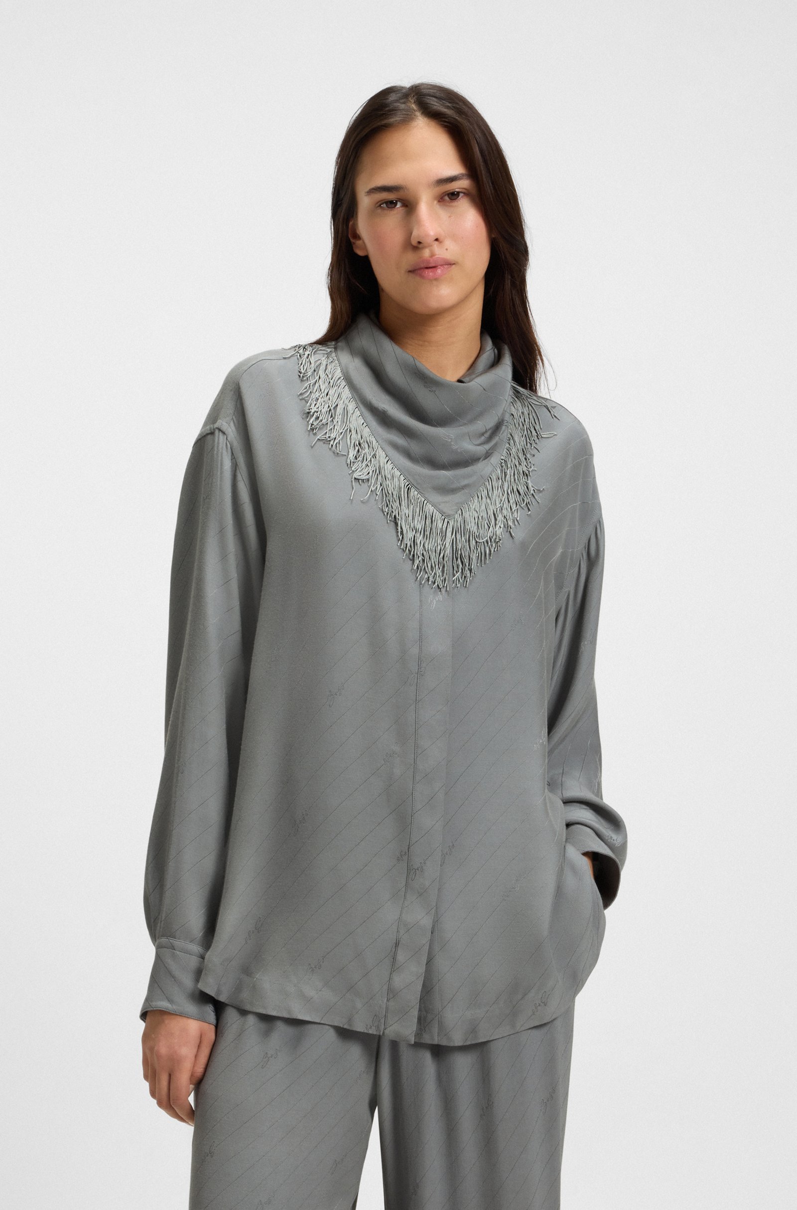 In an oversized fit with a rear pleat, this BOSS Womenswear blouse is loaded with detail. Fringe trims, logo jacquard and scarf accent. This product is made with cellulose fibres, derived from natural raw wood material and sourced from responsibly managed forests. We cooperate with external organisations to ensure respectful treatment of virgin and endangered forests.