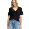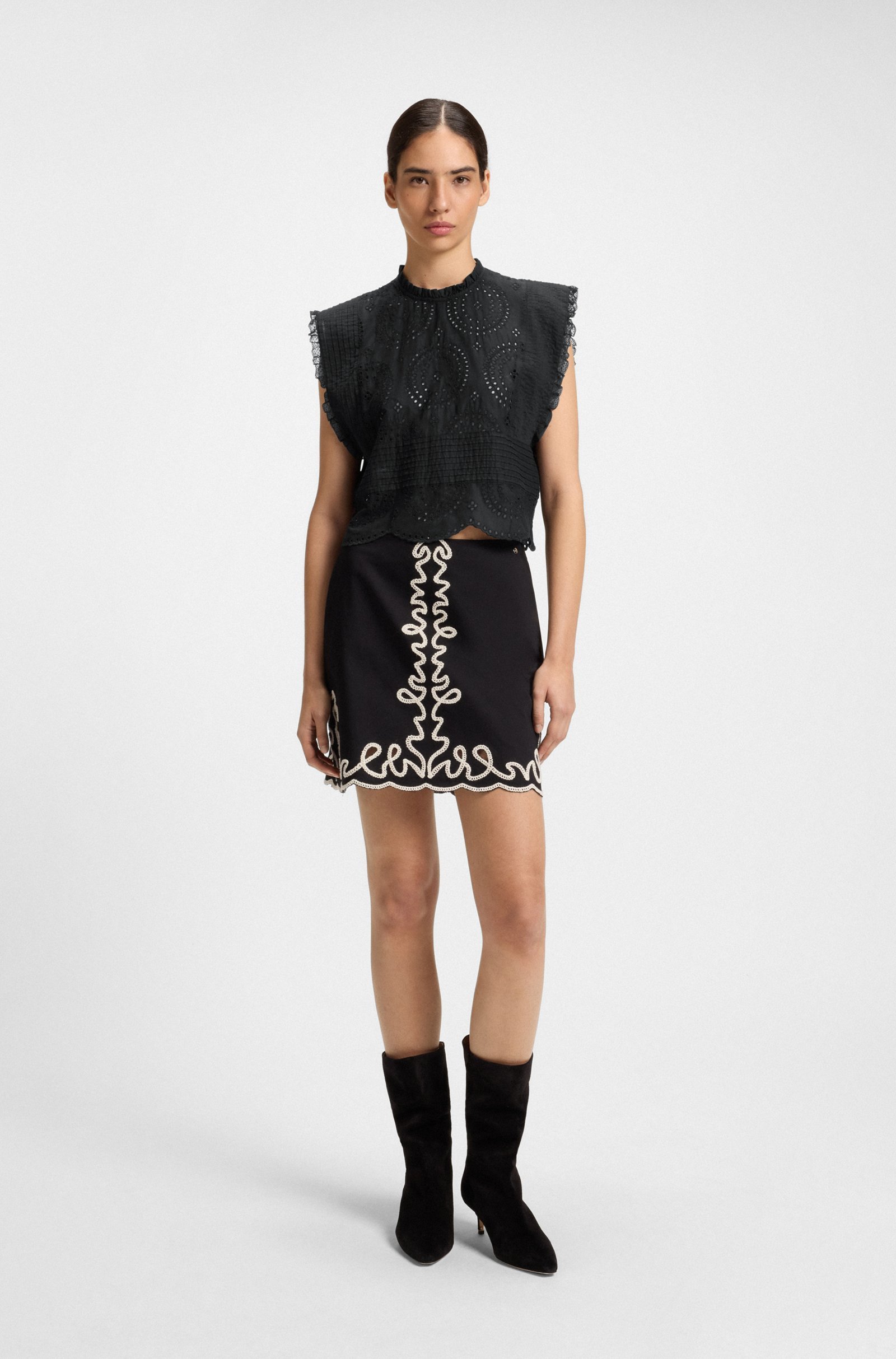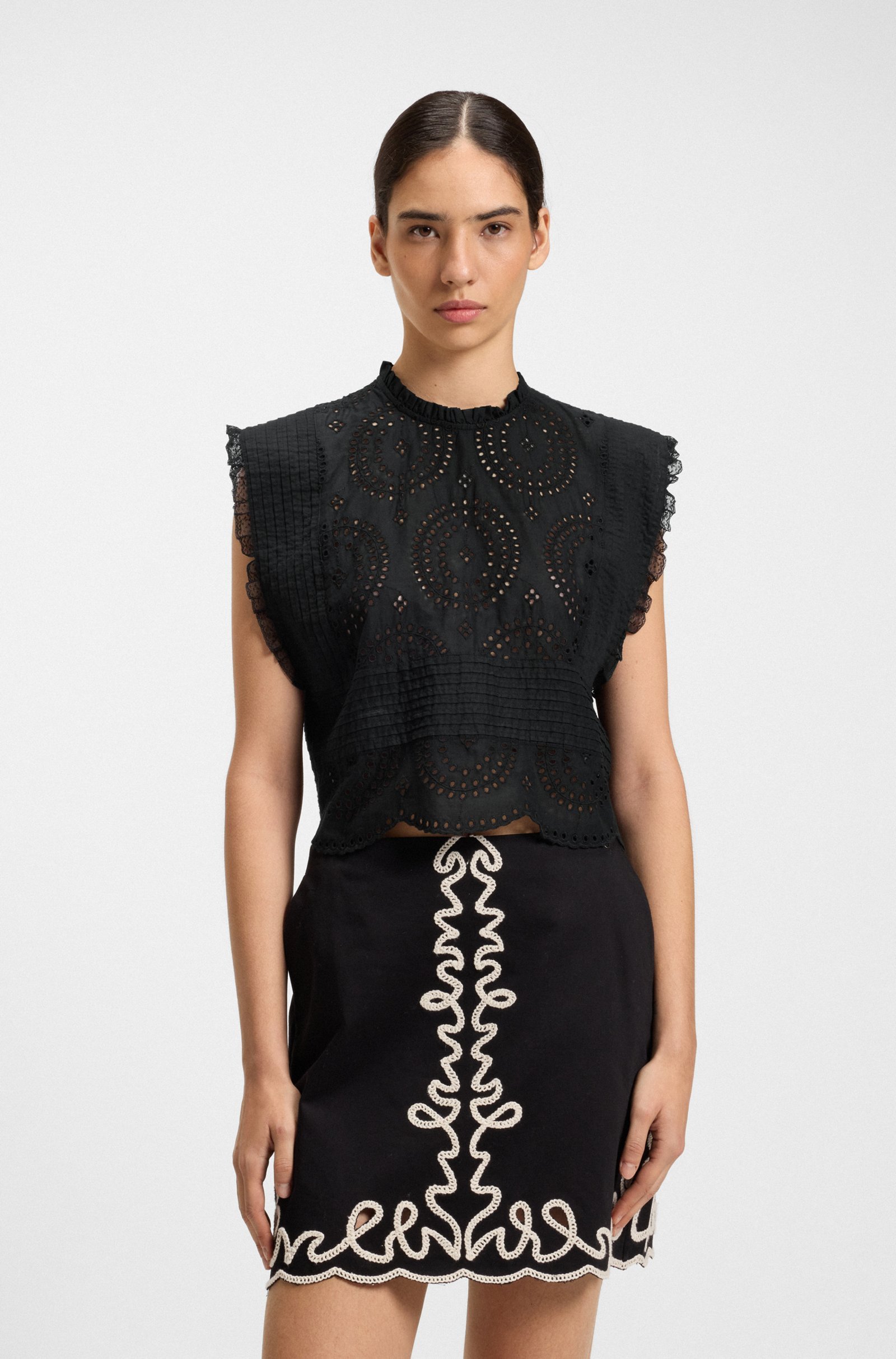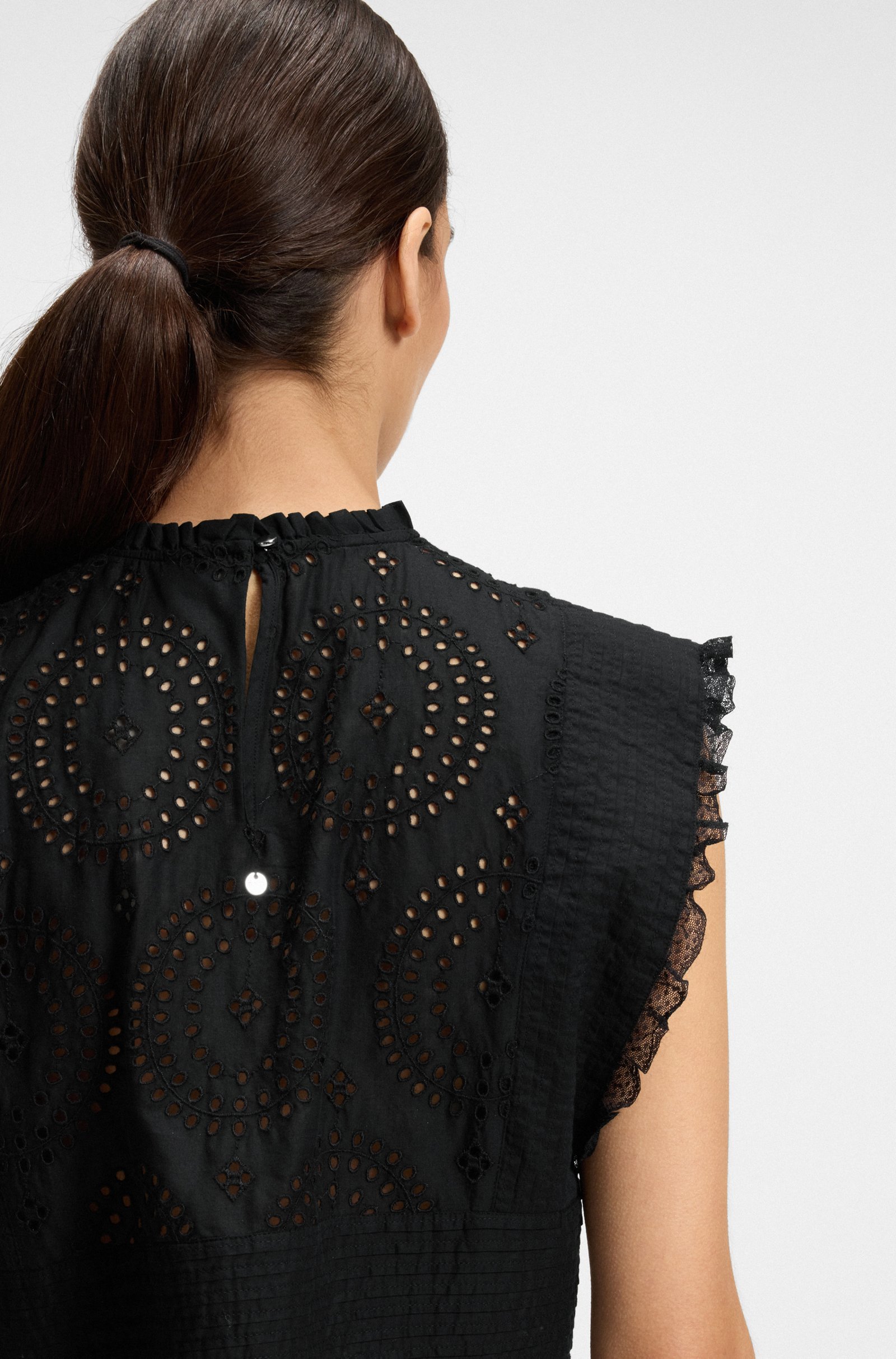 With fine pleats and lace trims, this BOSS Womenswear blouse offers summer sophistication. Crafted in airy cotton broderie. Easy straight fit.
