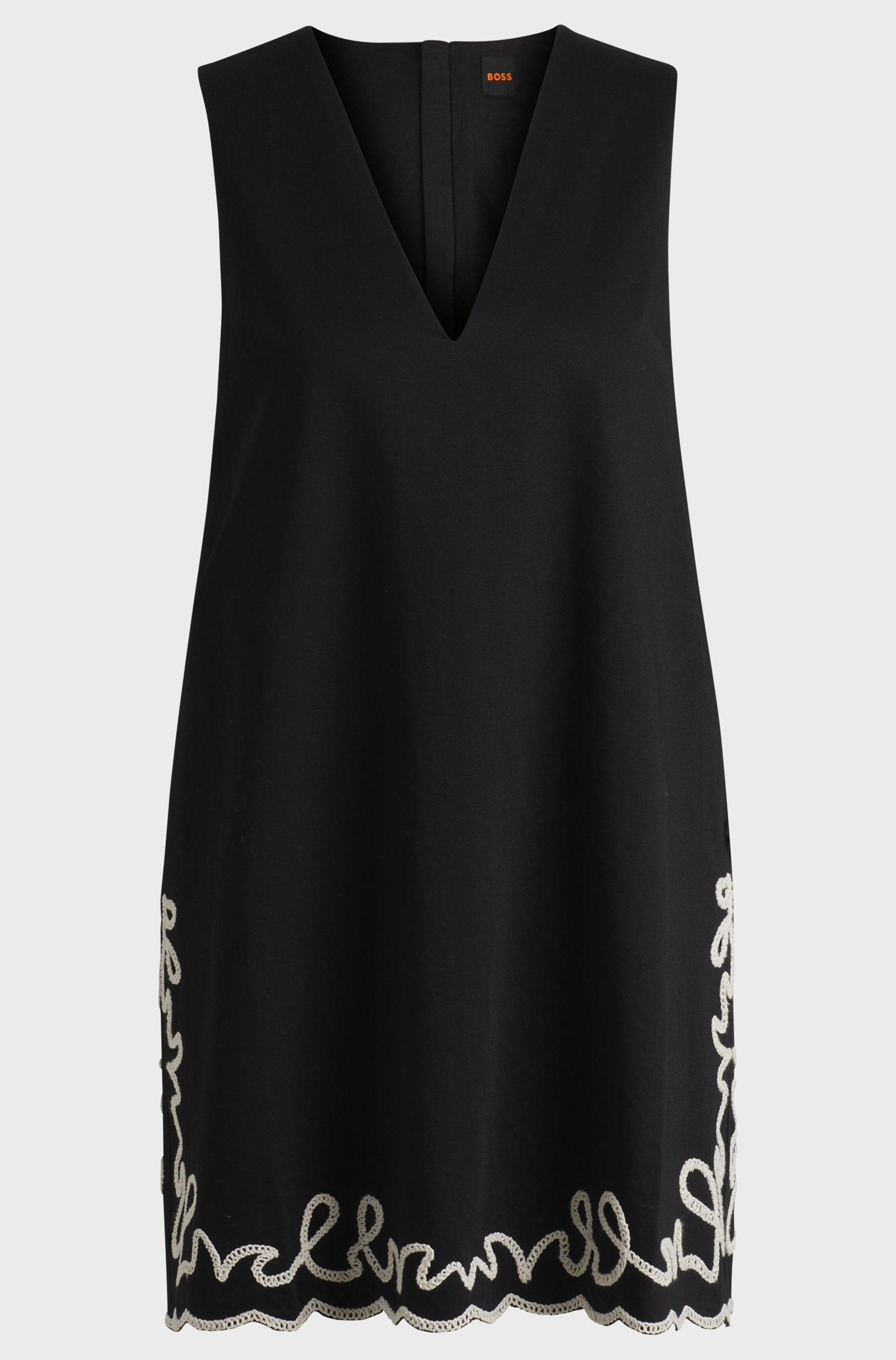 Cut with a slightly A-line shape, this BOSS Womenswear dress has pretty contrast embroidery for modern interest. V neckline. Weighty cotton twill.