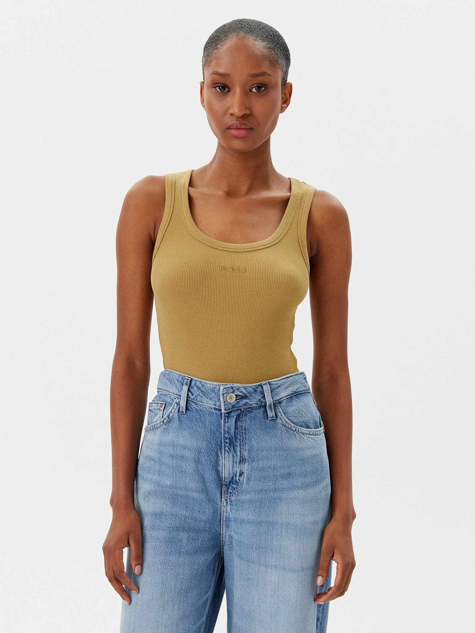 A scoop-neck top cut to a defined fit in stretch material woven with a ribbed structure by BOSS Womenswear.
