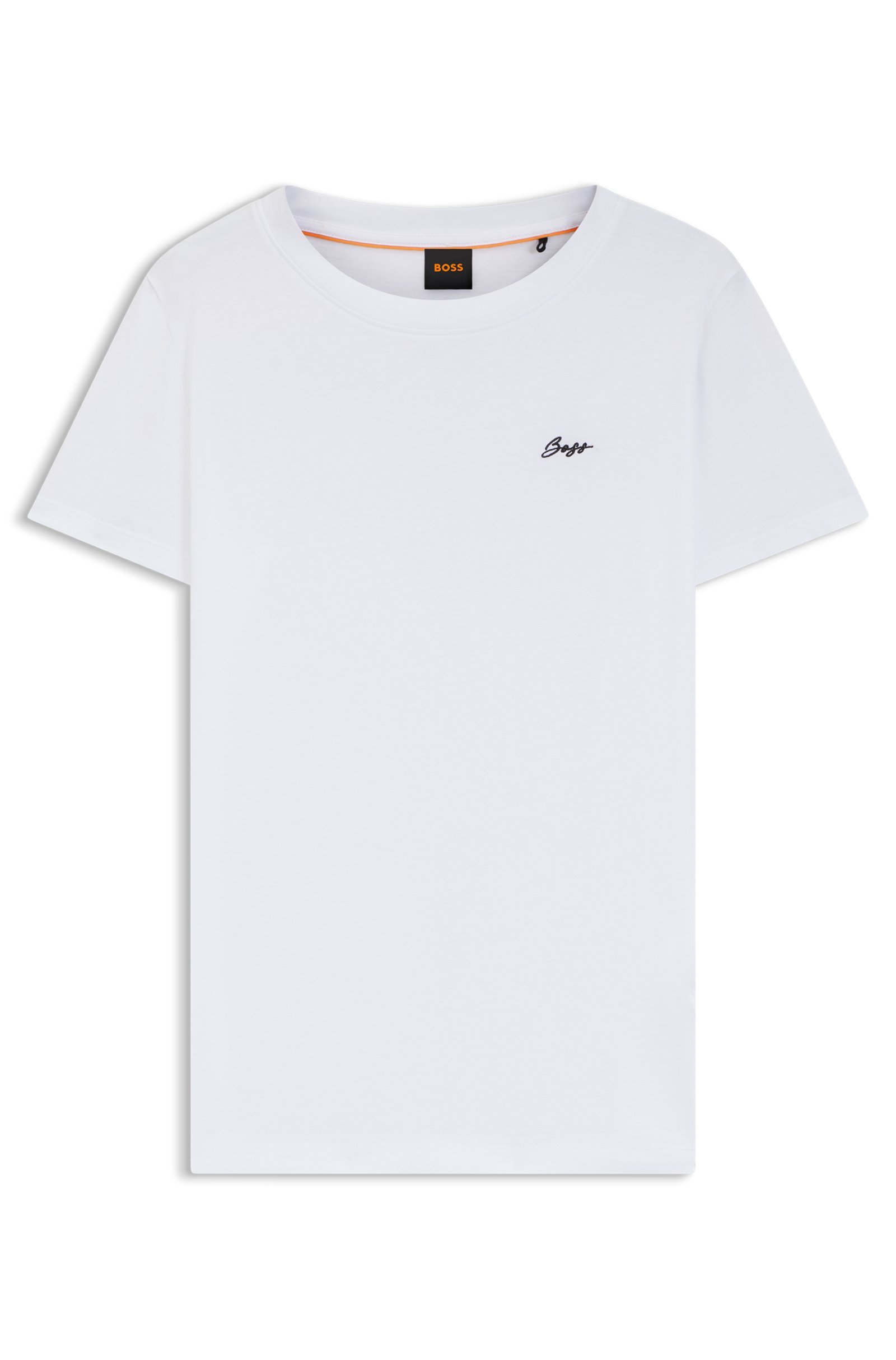 Updating a wardrobe essential, this BOSS Womenswear T-shirt features a handwritten logo embroidered in lustrous yarn. Soft cotton jersey for casual comfort. Crew neckline.