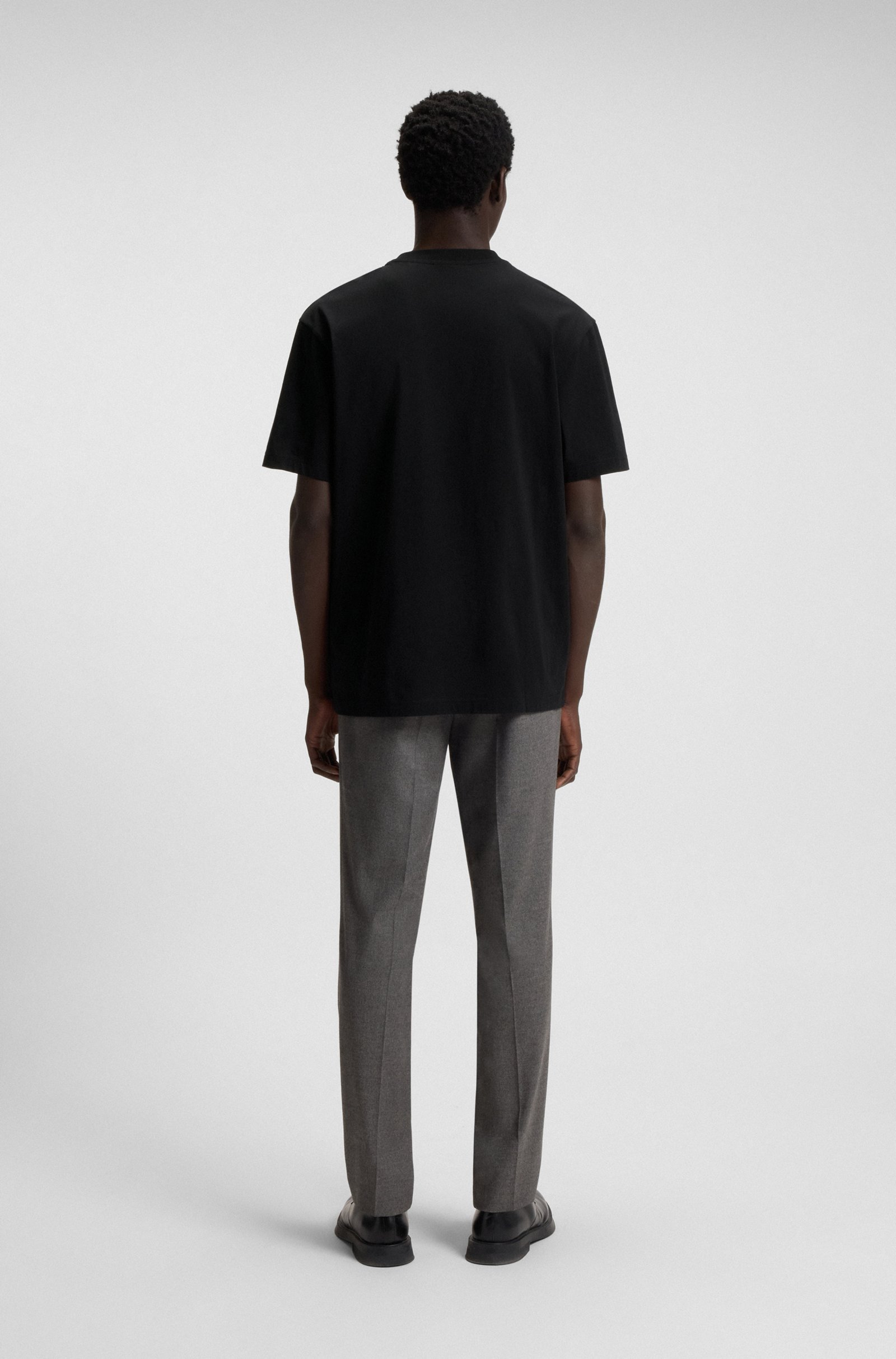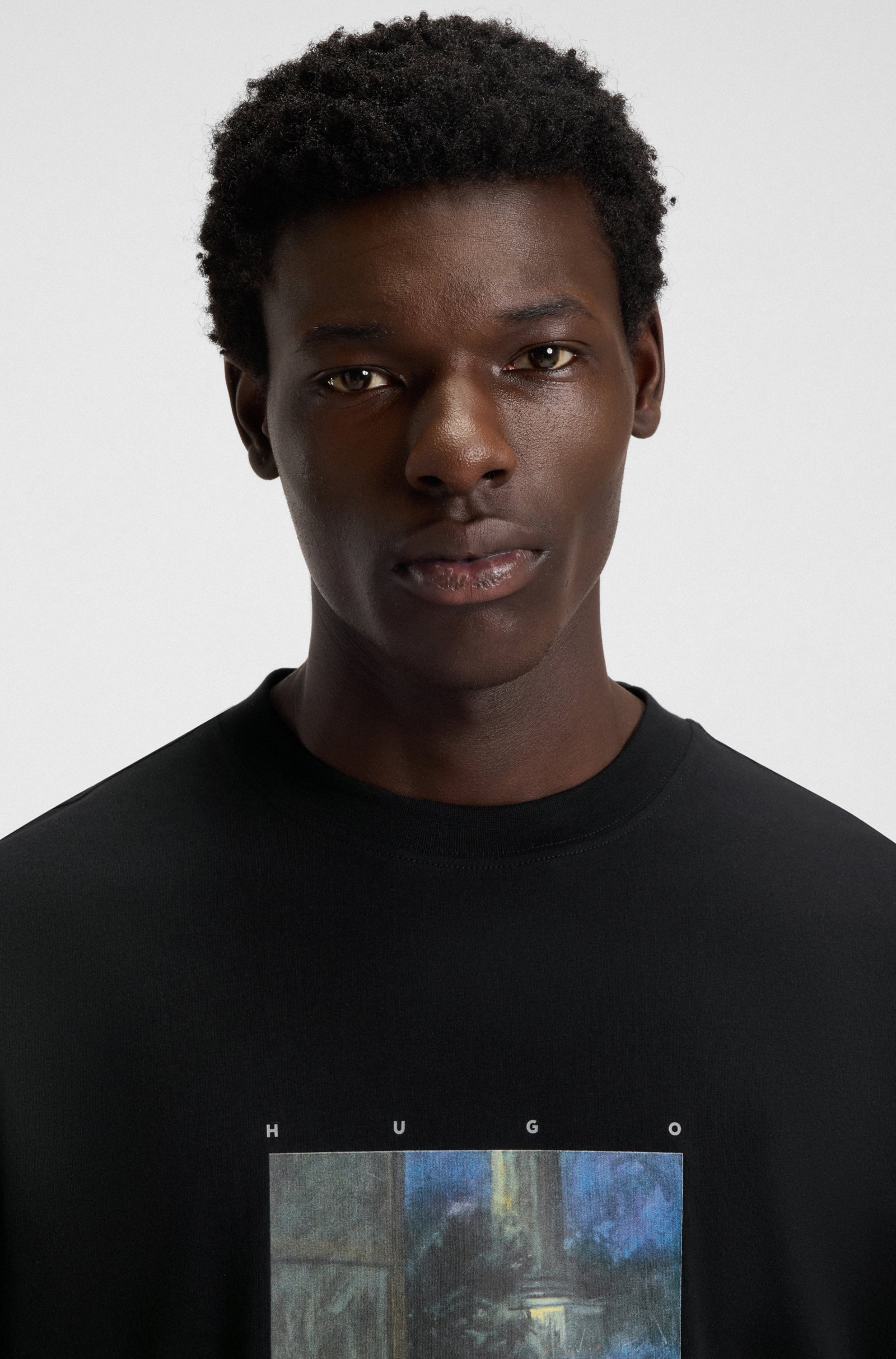 Add impact to casual looks with the statement ballerina artwork of this HUGO Menswear T-shirt. Laid-back fit in comfortable cotton jersey. Logo detail. This product contains at least 60% better raw materials. This piece is made with at least 60% cotton derived from regenerative agriculture. Regenerative agriculture prioritizes the preservation and restoration of natural environments, aiming to enhance biodiversity, maintain water quality, and improve soil health.