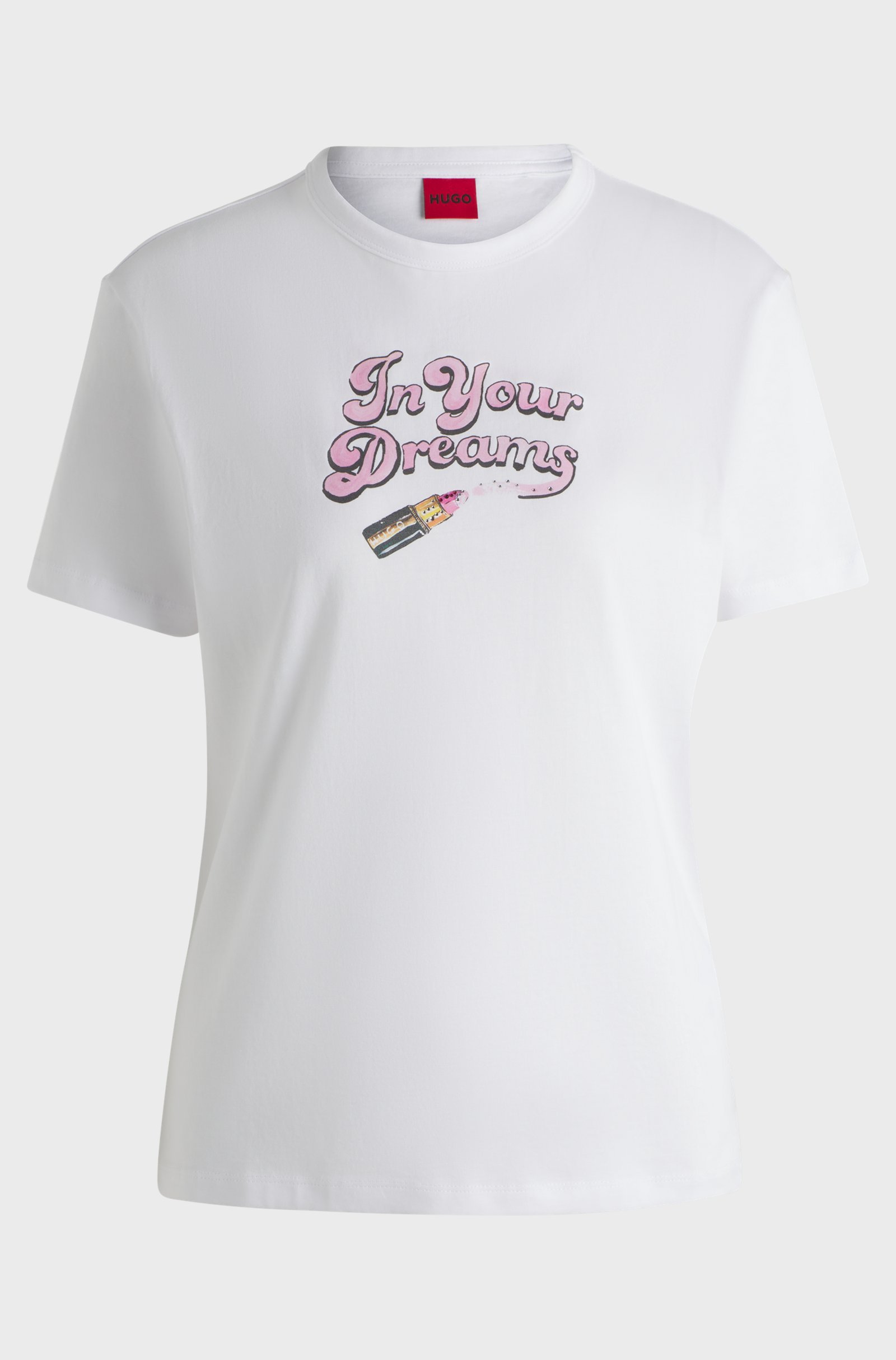 Available with different graphic prints, this regular fit HUGO Womenswear T-shirt is so easy to style. Soft cotton jersey for everyday comfort. This product’s raw material is derived from regenerative agriculture: an approach focused on preservation and restoration that aims to increase biodiversity, preserve water quality and improve soil health while absorbing CO2. Regenerative agriculture also promotes animal welfare and fair working conditions for farmers