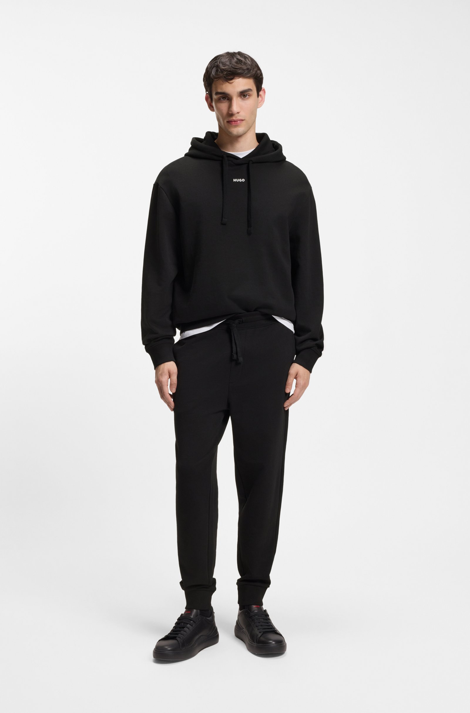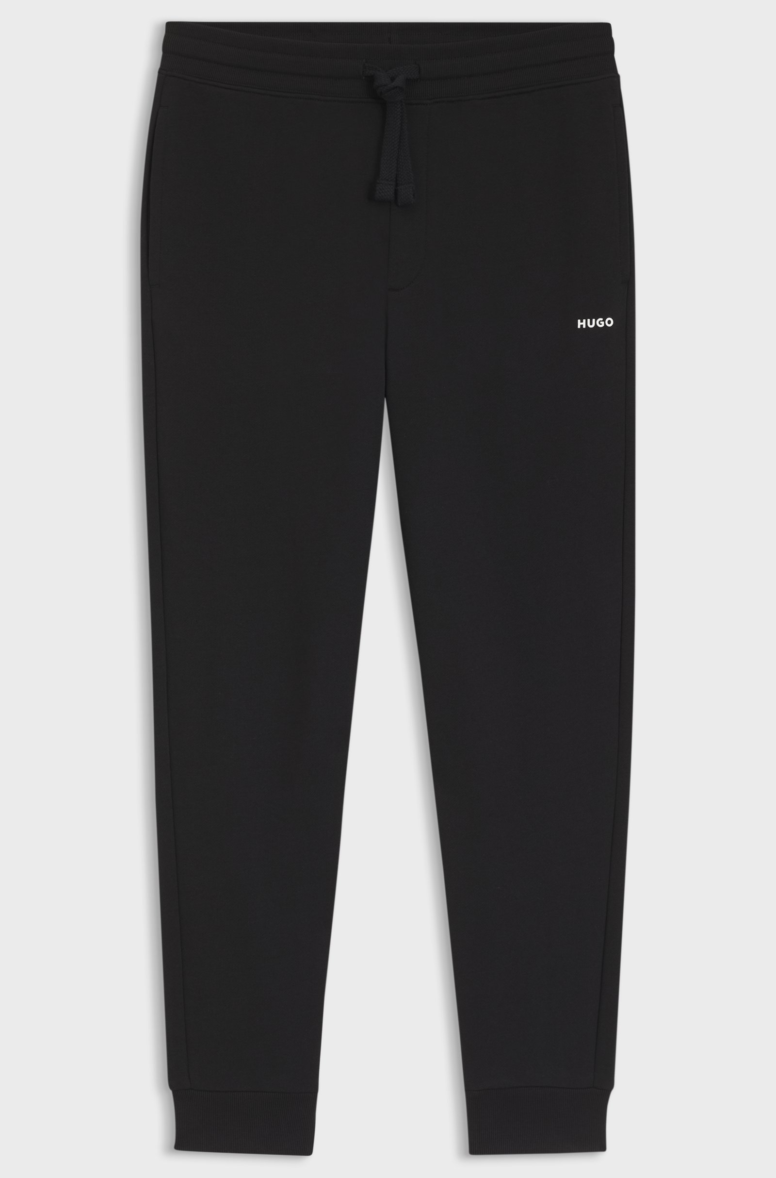 Featuring a logo print, these HUGO Menswear tracksuit bottoms are cut to a straight fit in soft cotton terry. Cuffed hems. Drawstring waist.