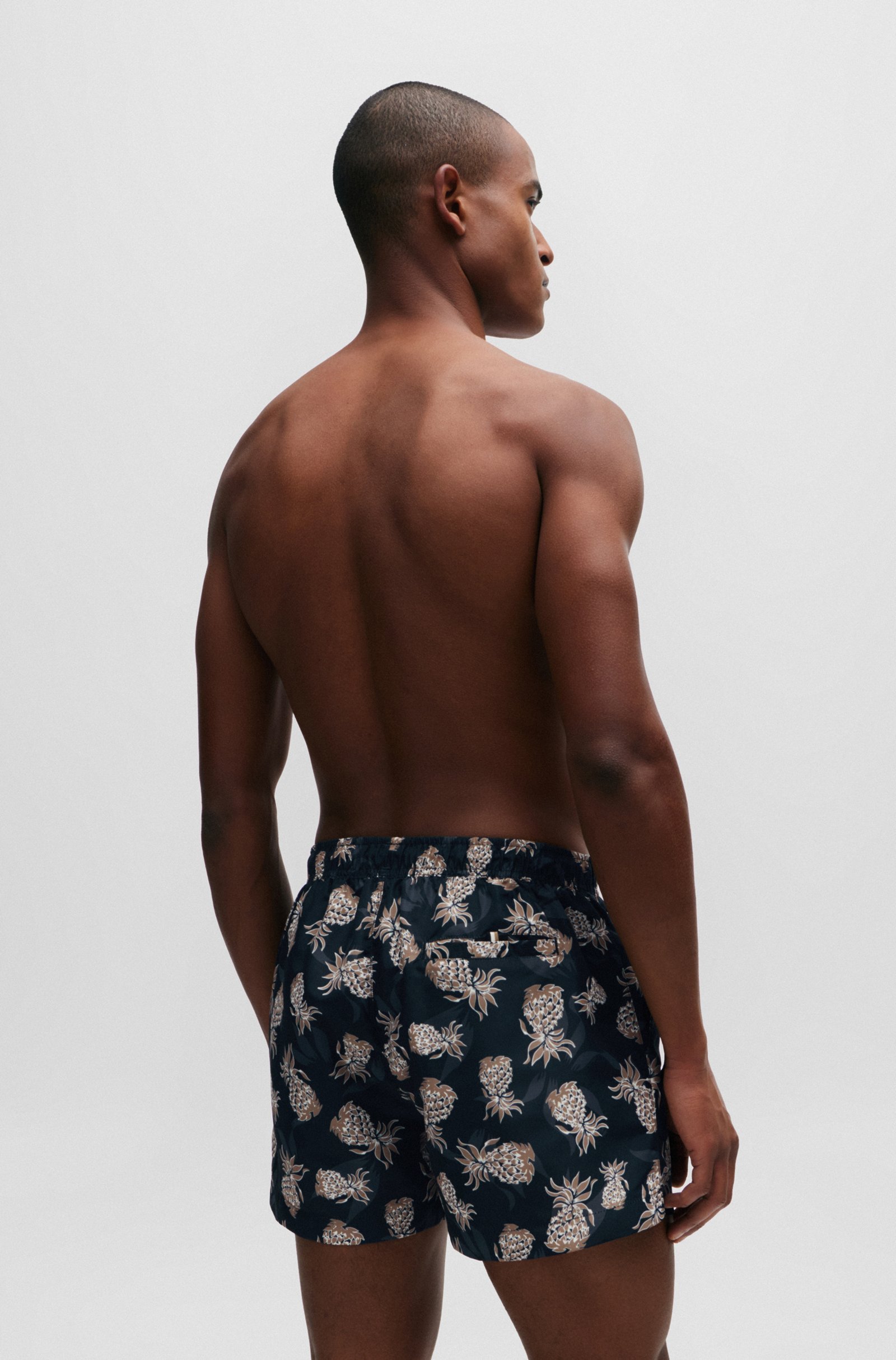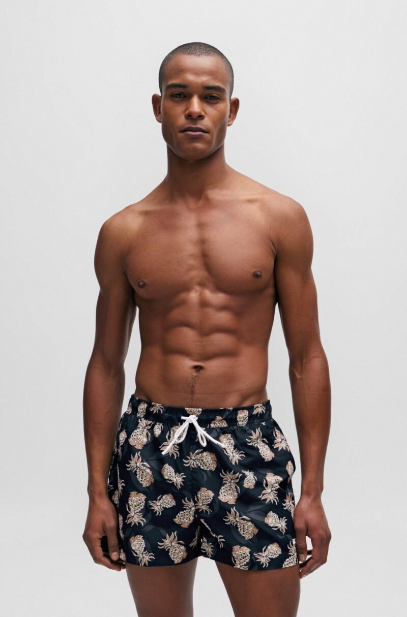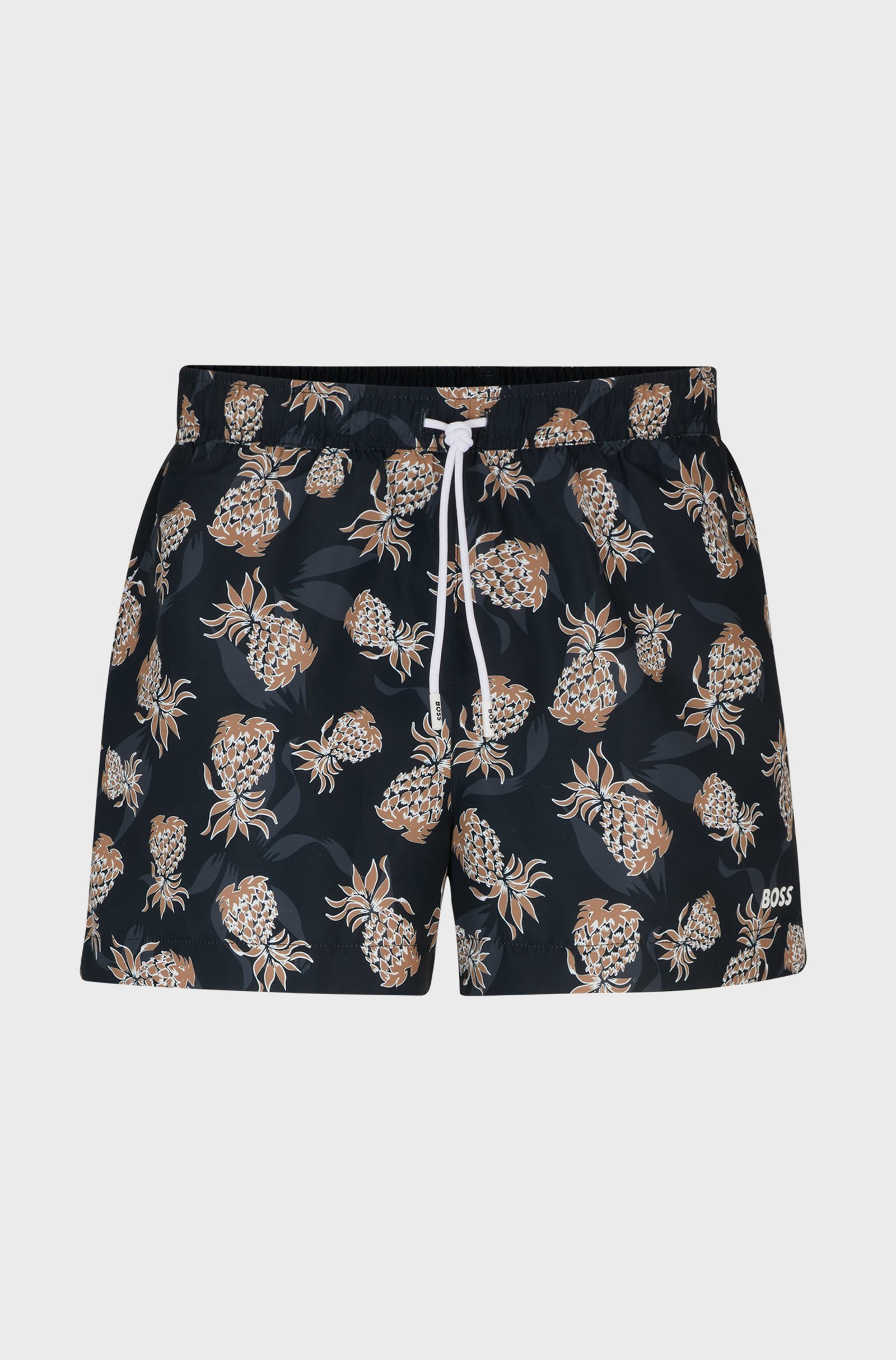 Fully lined swim shorts in soft material with a logo detail and an all-over pineapple motif by BOSS. For our BETTER BOSS products, we always use at least 60% better raw materials. This product is made from at least 60% recycled polyester. Recycled polyester is an artificial fibre made from oil-based waste such as old PET bottles.