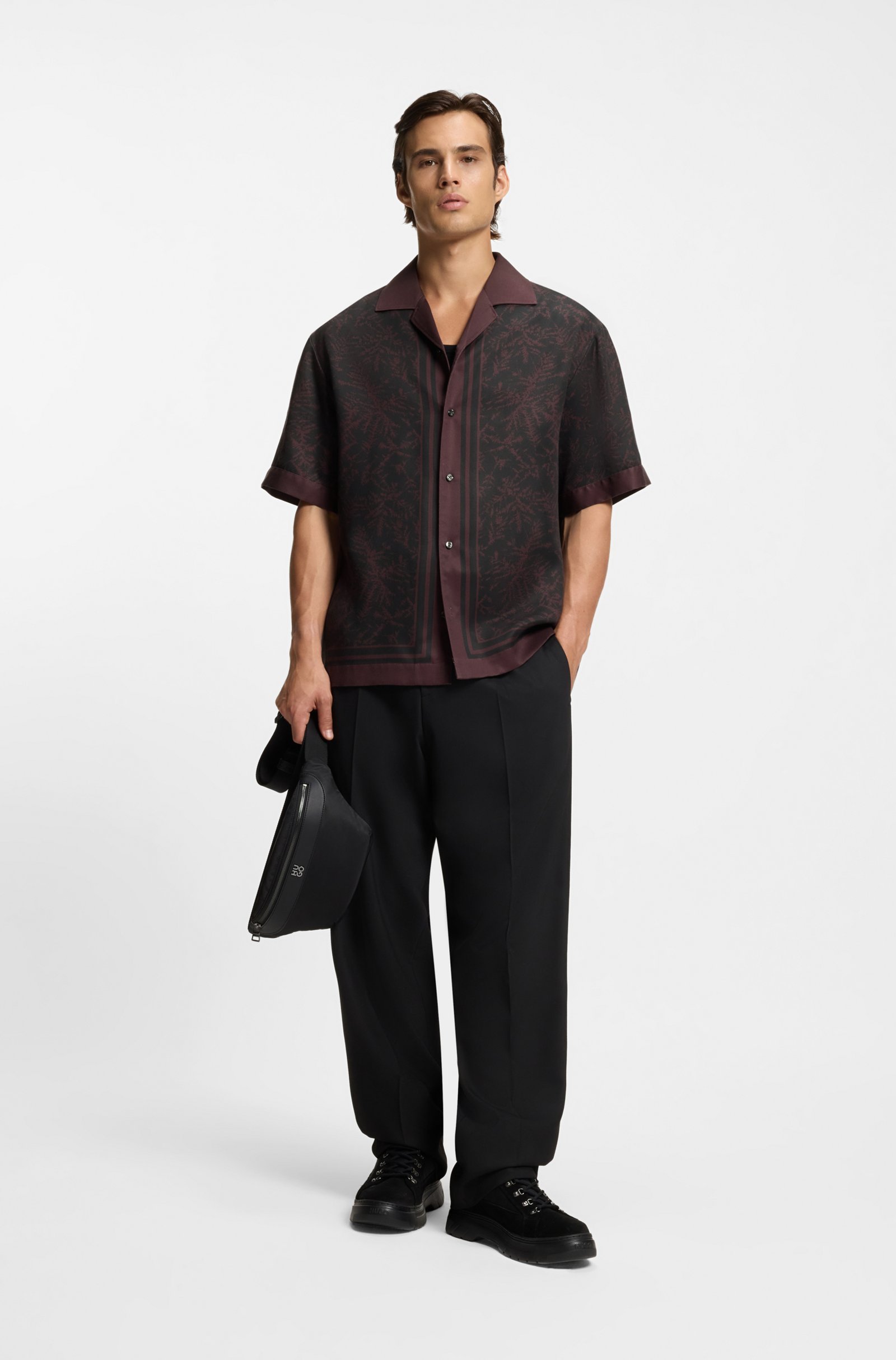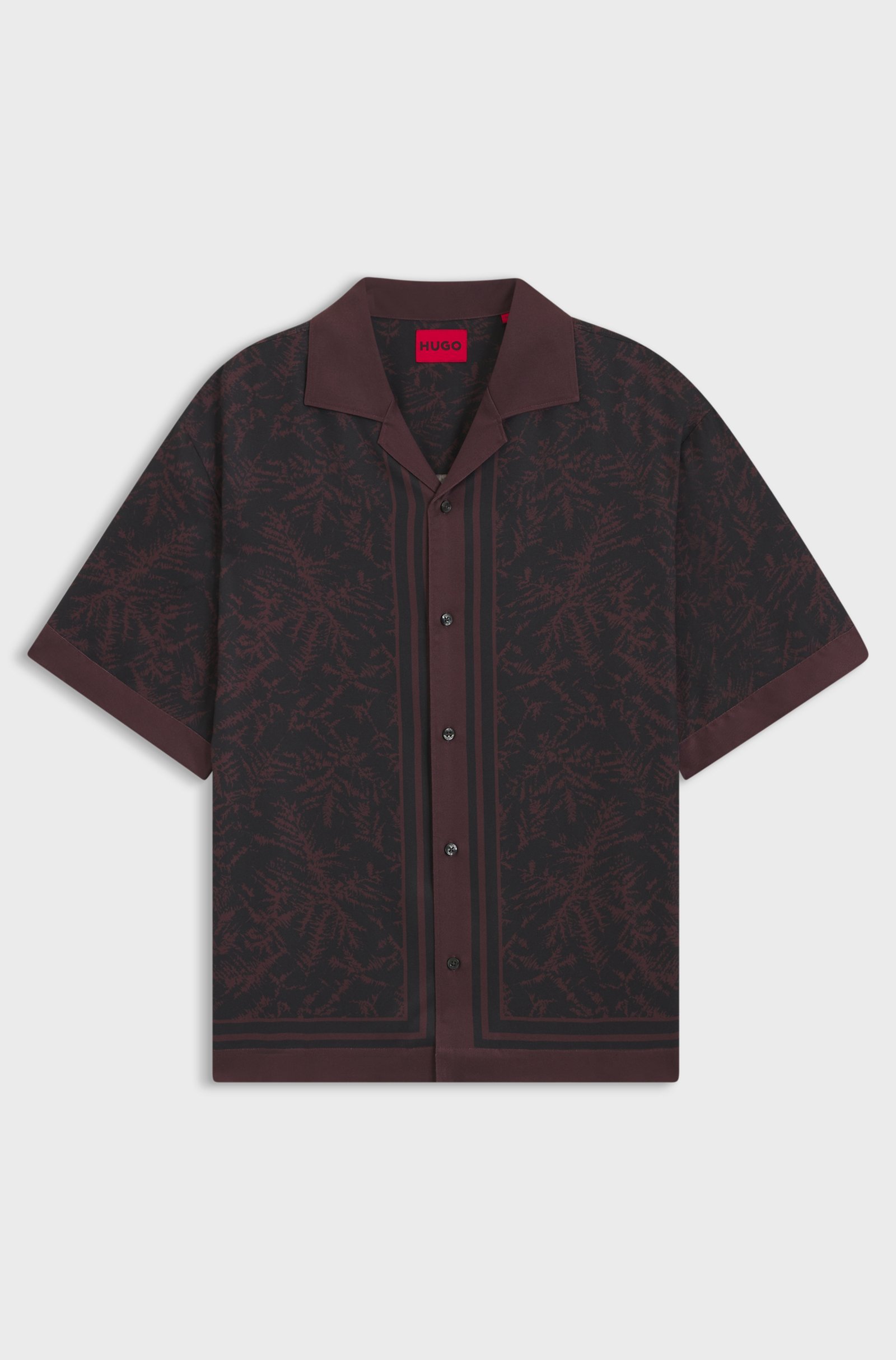 Featuring a statement print on soft, drapey fabric, this HUGO Menswear shirt is an effortless casual option. Cut to a roomy fit. This product contains at least 80% better raw materials. This product is made with cellulose fibres, derived from natural raw wood material and sourced from responsibly managed forests. We cooperate with external organisations to ensure respectful treatment of virgin and endangered forests.
