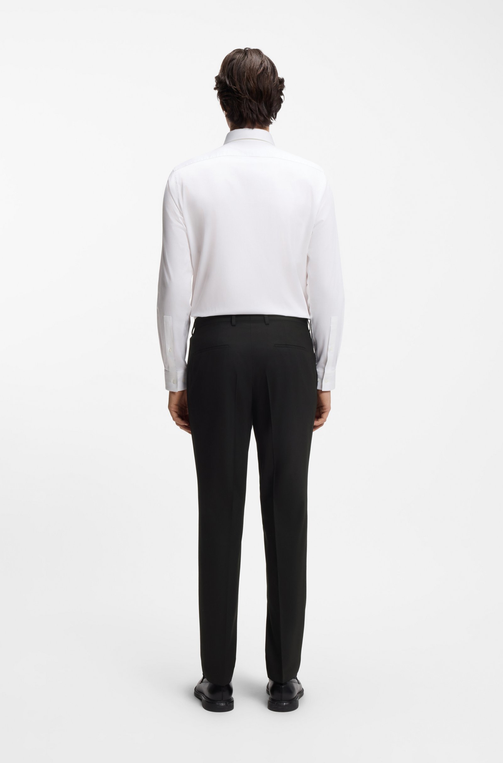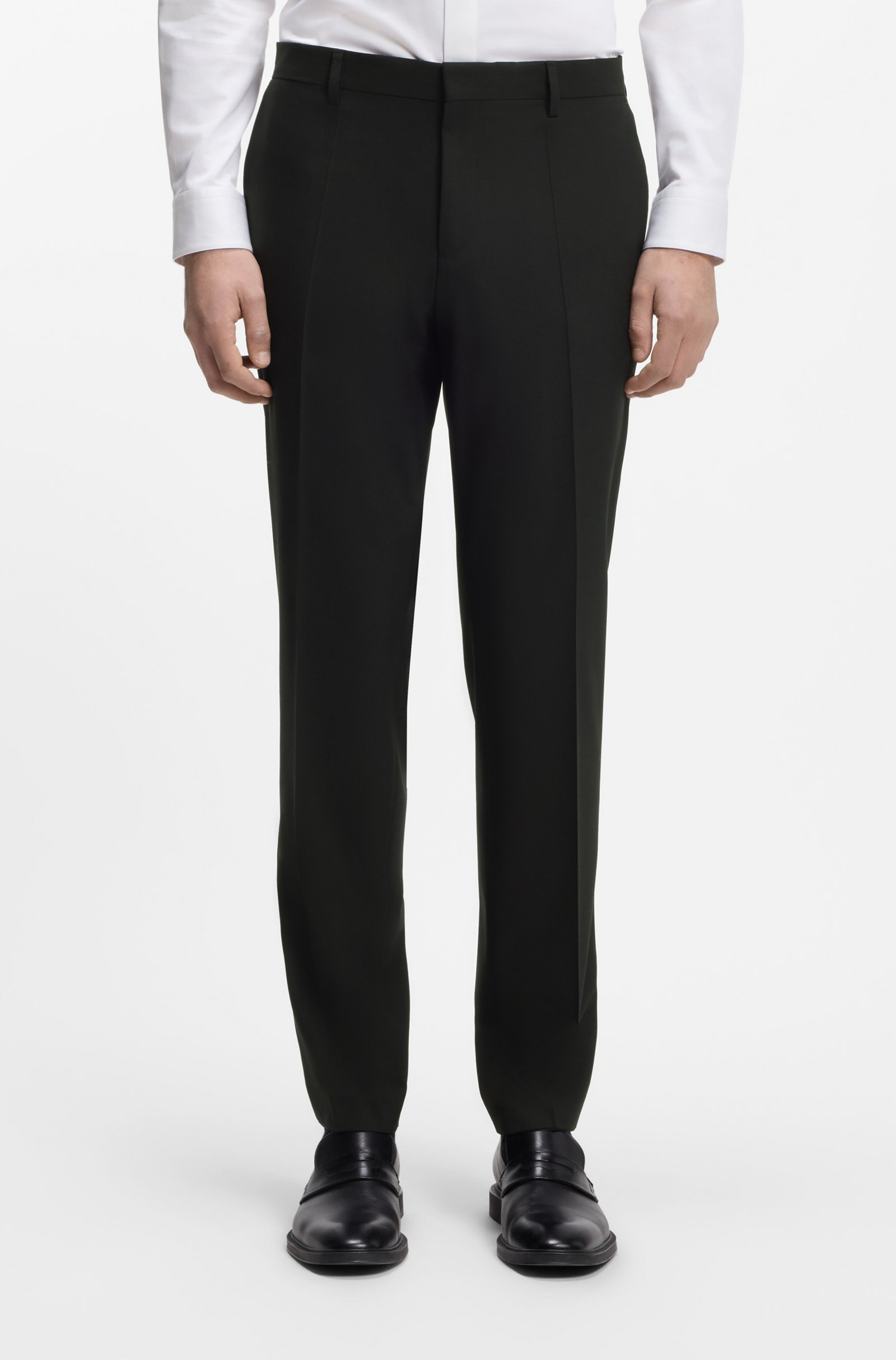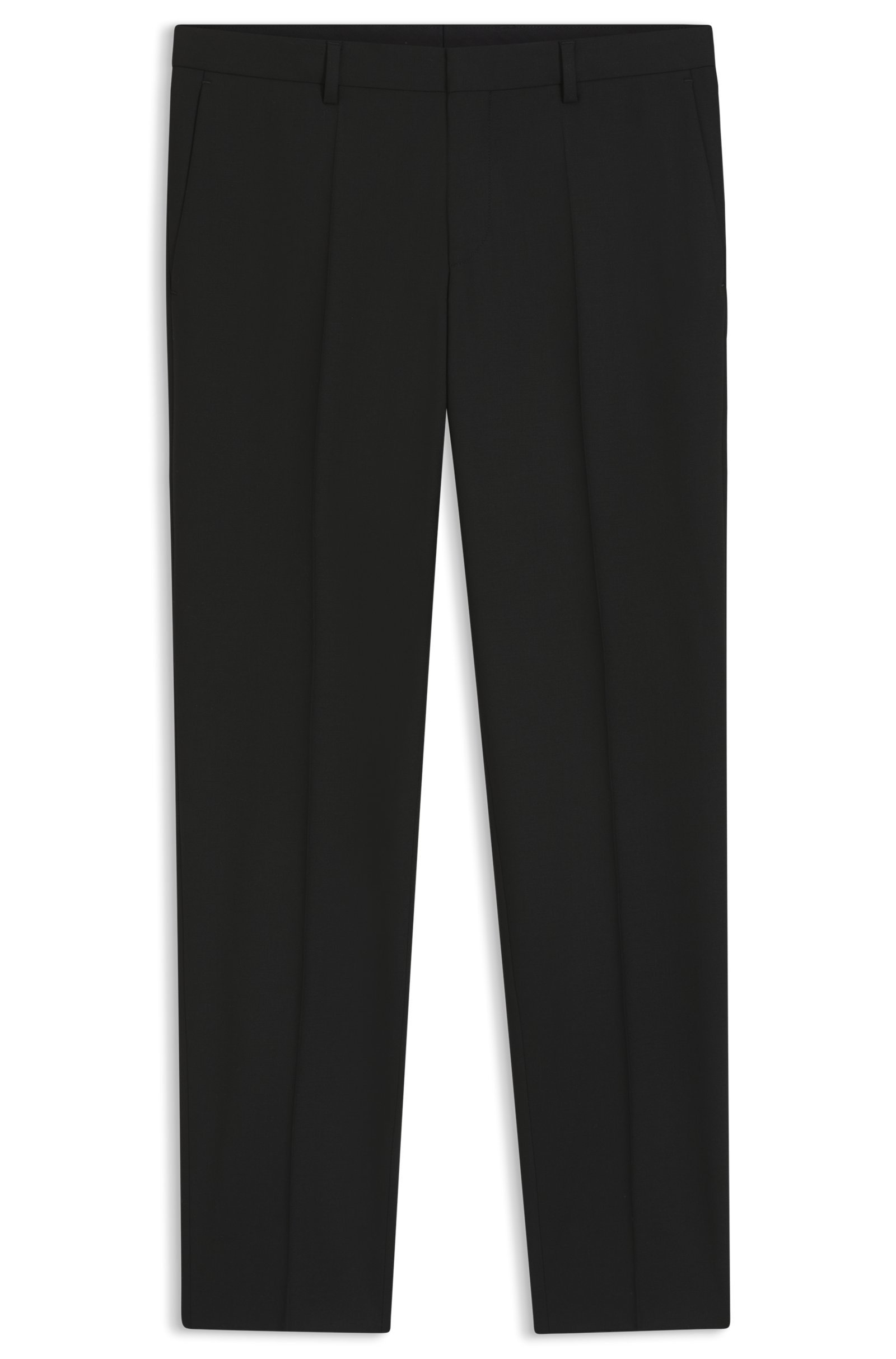 Cut to a slim fit in performance-stretch fabric, these HUGO Menswear trousers will become a favorite foundation. Extra-soft wool-blend poplin. Pleat front