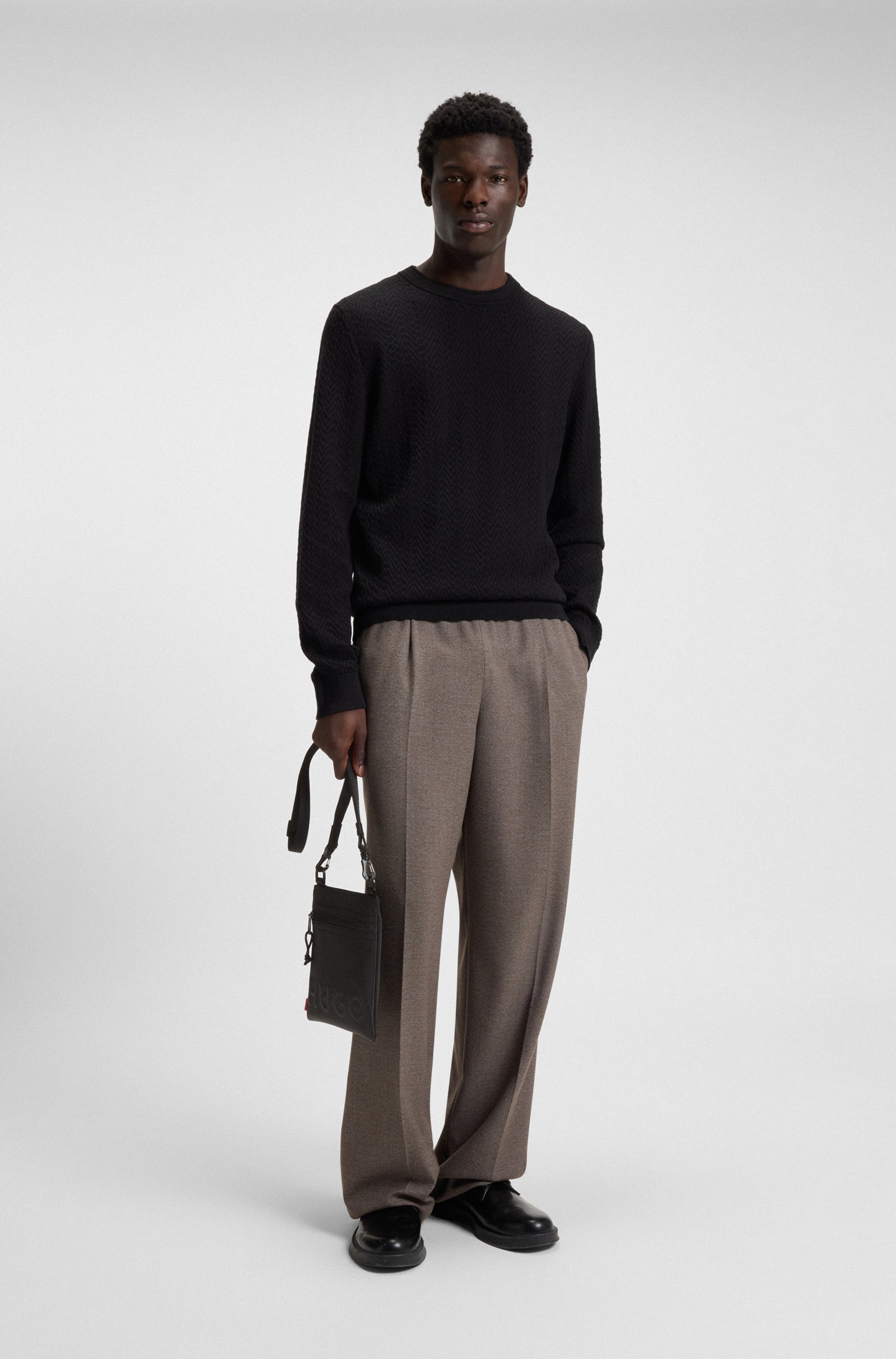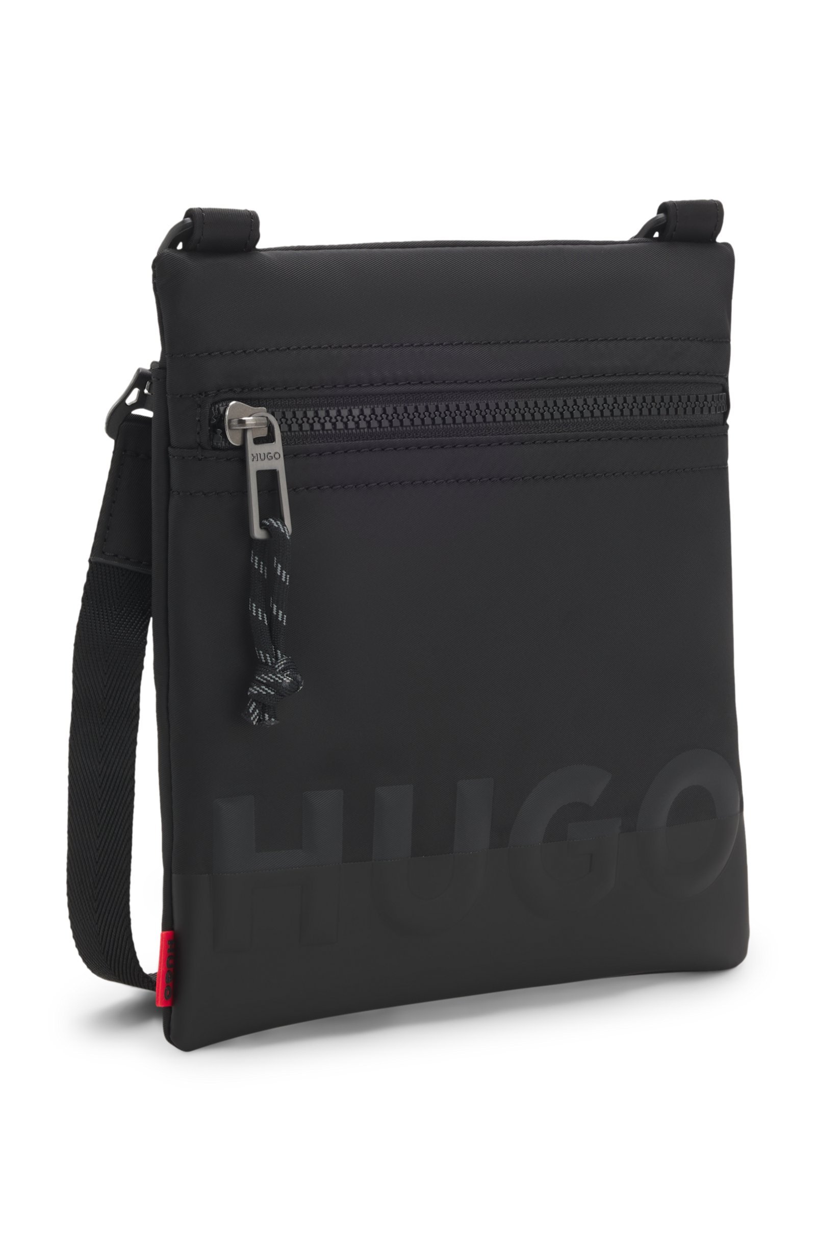 Printed with a split logo in mixed effects, this HUGO Menswear bag is ideal for keeping necessities close. Crafted in smooth matte twill. Measurements: 23 x 21 x 3cms.