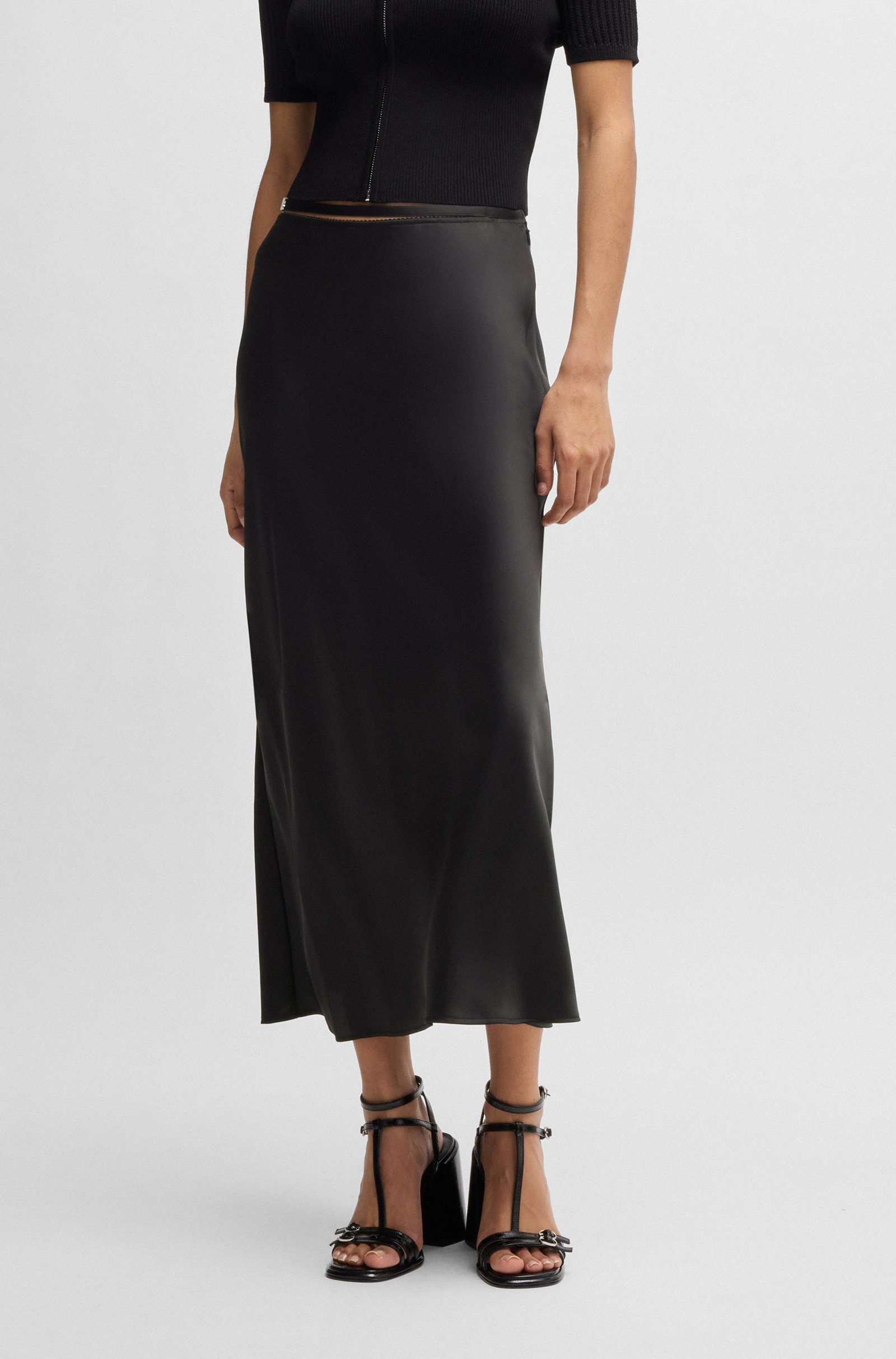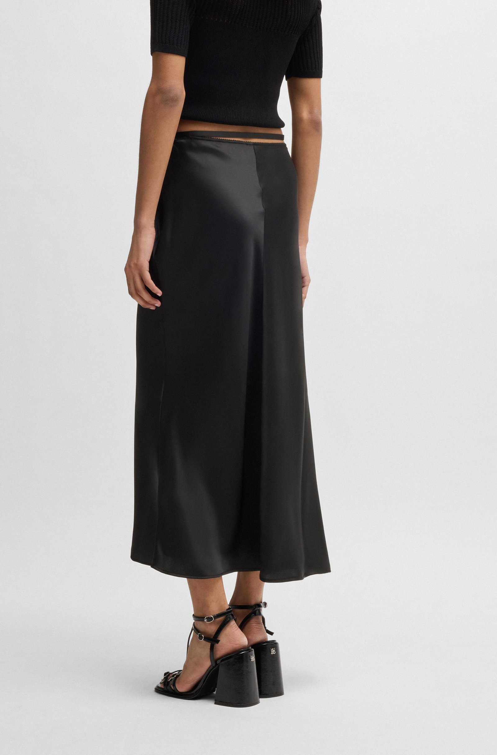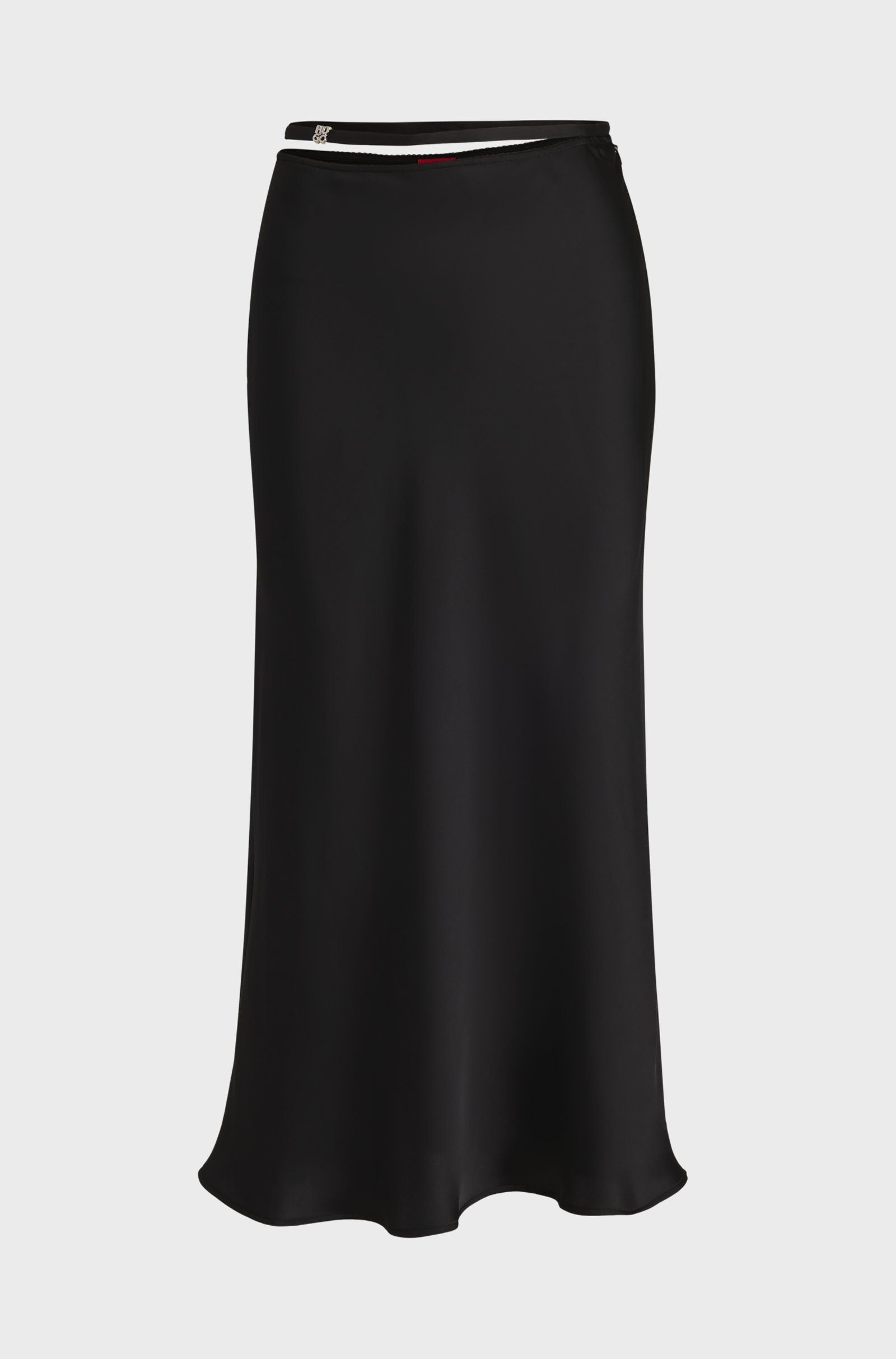 An elegant A-line midi skirt by HUGO Womenswear, designed in soft satin. A mini stacked-logo charm trims the decorative ribbon at the waist.