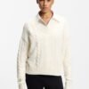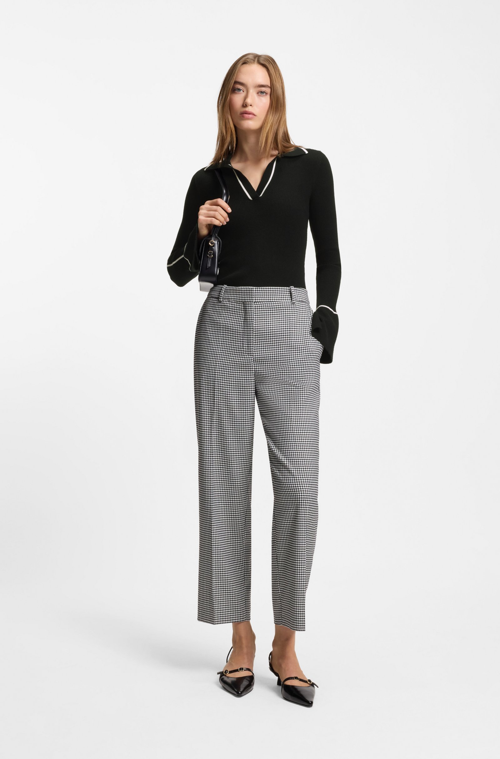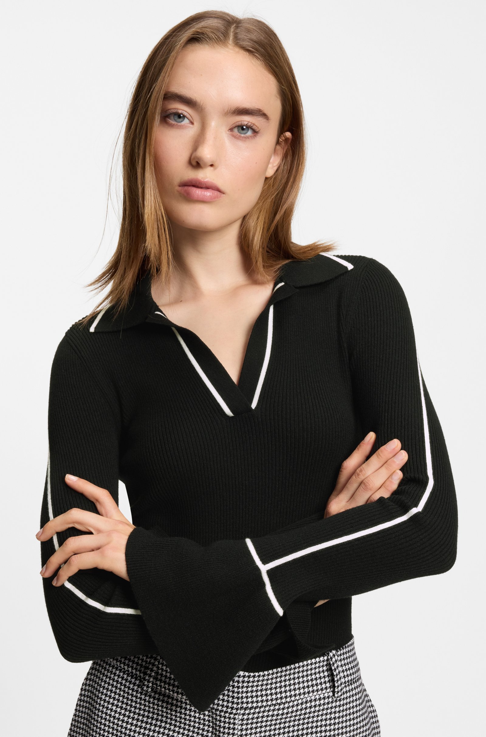 With its slim cut and high flared cuffs, this HUGO Womenswear ribbed sweater creates a contemporary look. Polo collar. Contrast piping. Stacked-logo embroidery.