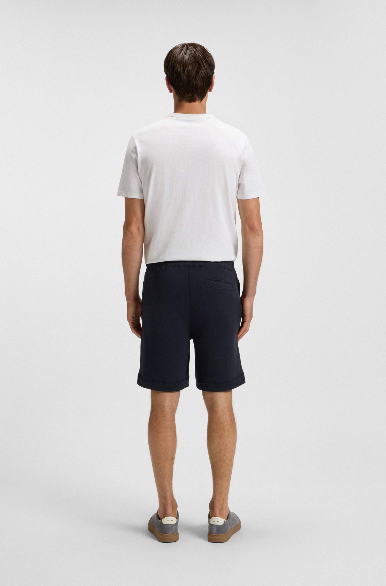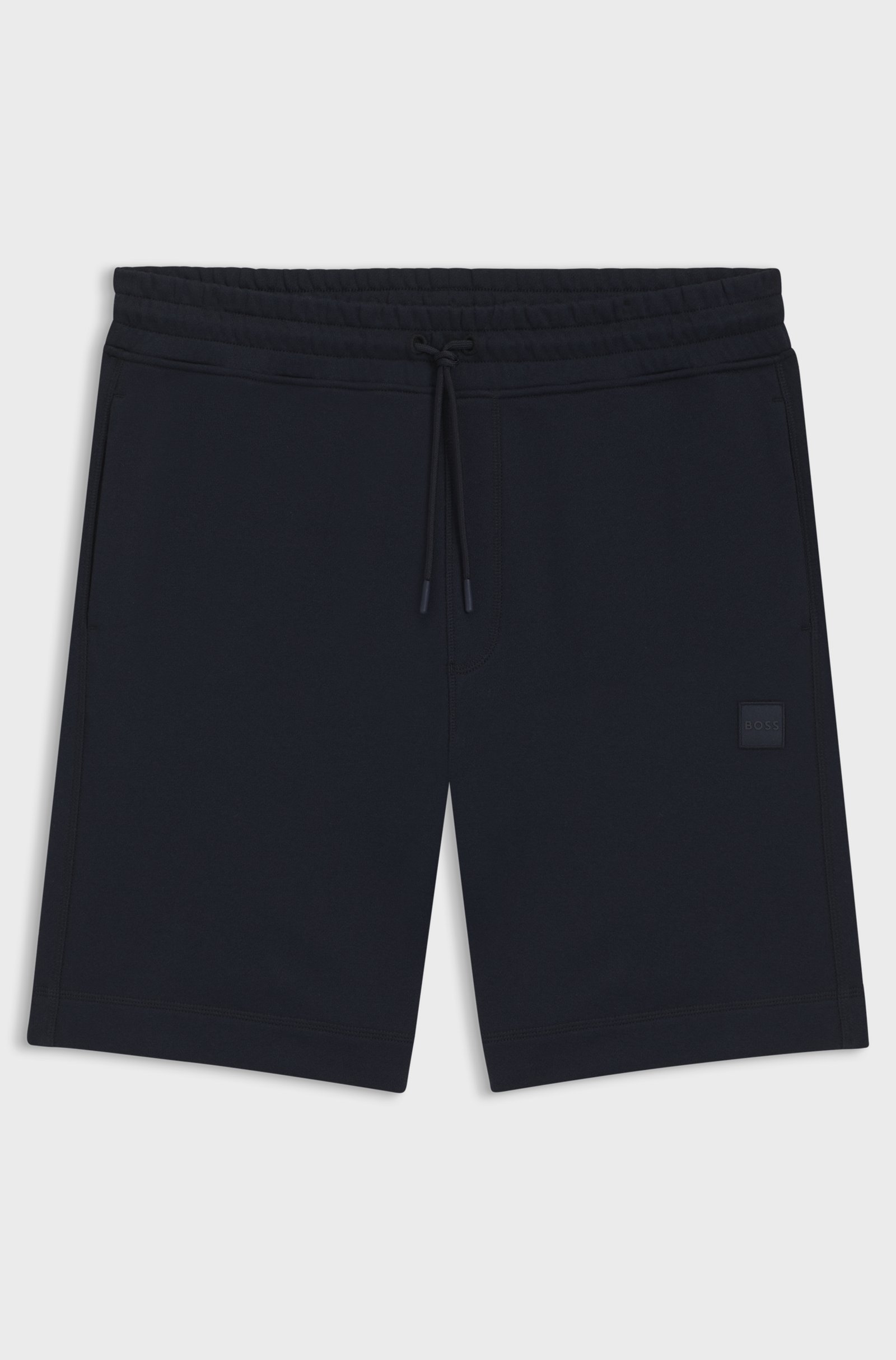 Signature cotton shorts by BOSS Menswear. Tonal rubber logo badge. Easy relaxed-fit. Elasticated drawstring waistband.