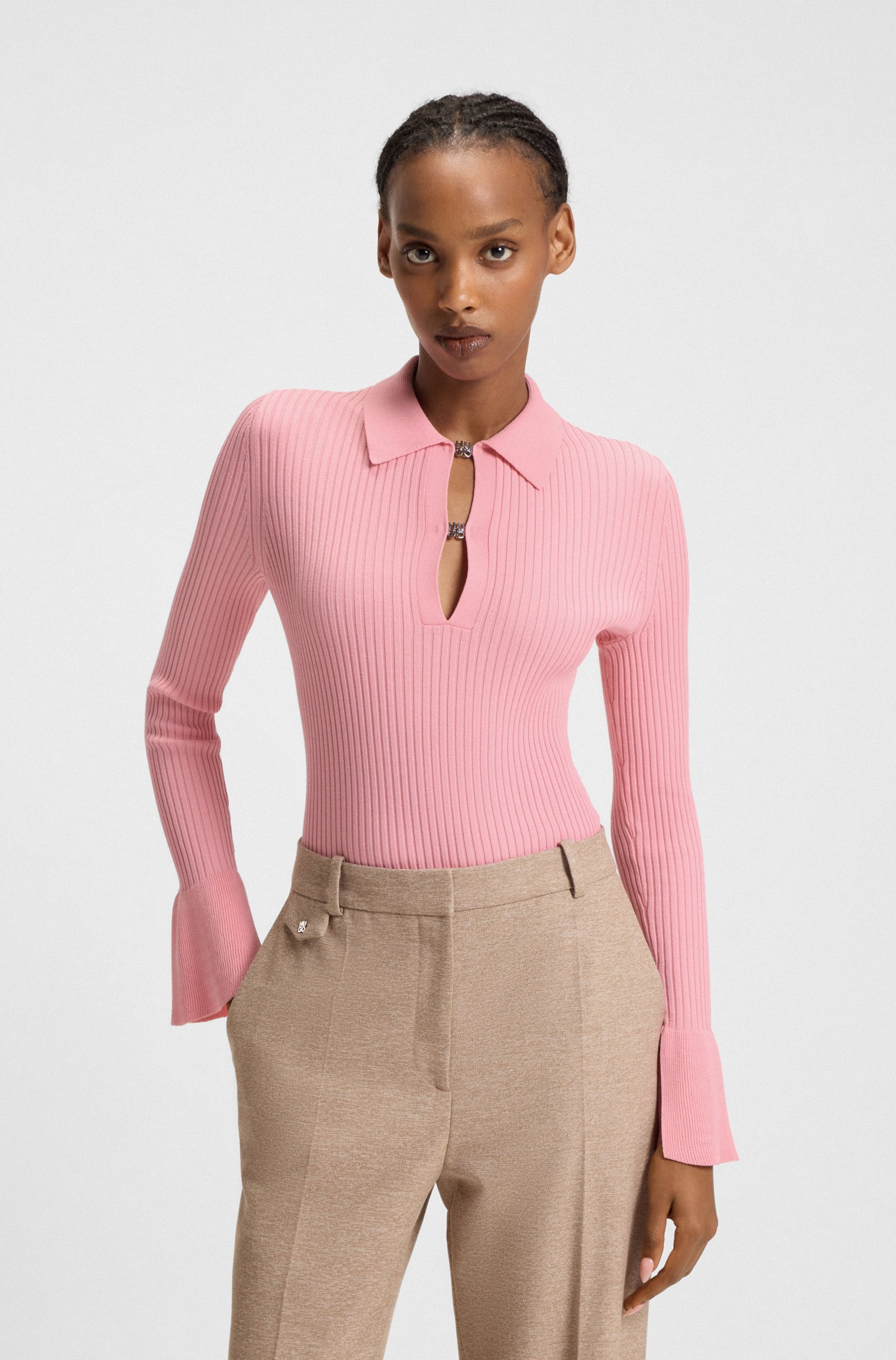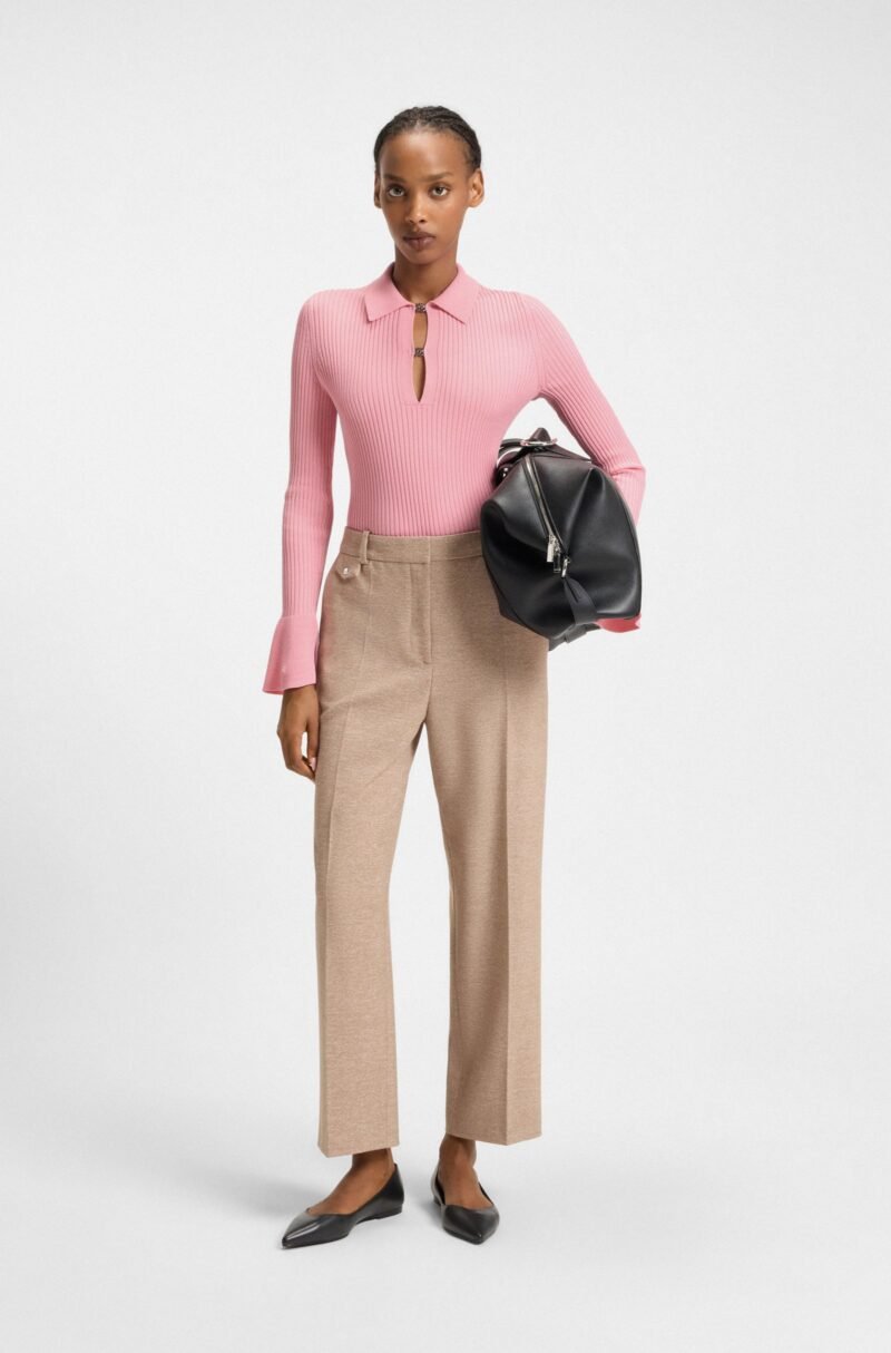 Featuring stacked-logo hardware at the placket, this HUGO Womenswear knit polo is a flattering, form-fitting layer. Crafted in ribbed crepe. Statement oversized cuffs. This product is made with cellulose fibres, derived from natural raw wood material and sourced from responsibly managed forests. We cooperate with external organisations to ensure respectful treatment of virgin and endangered forests