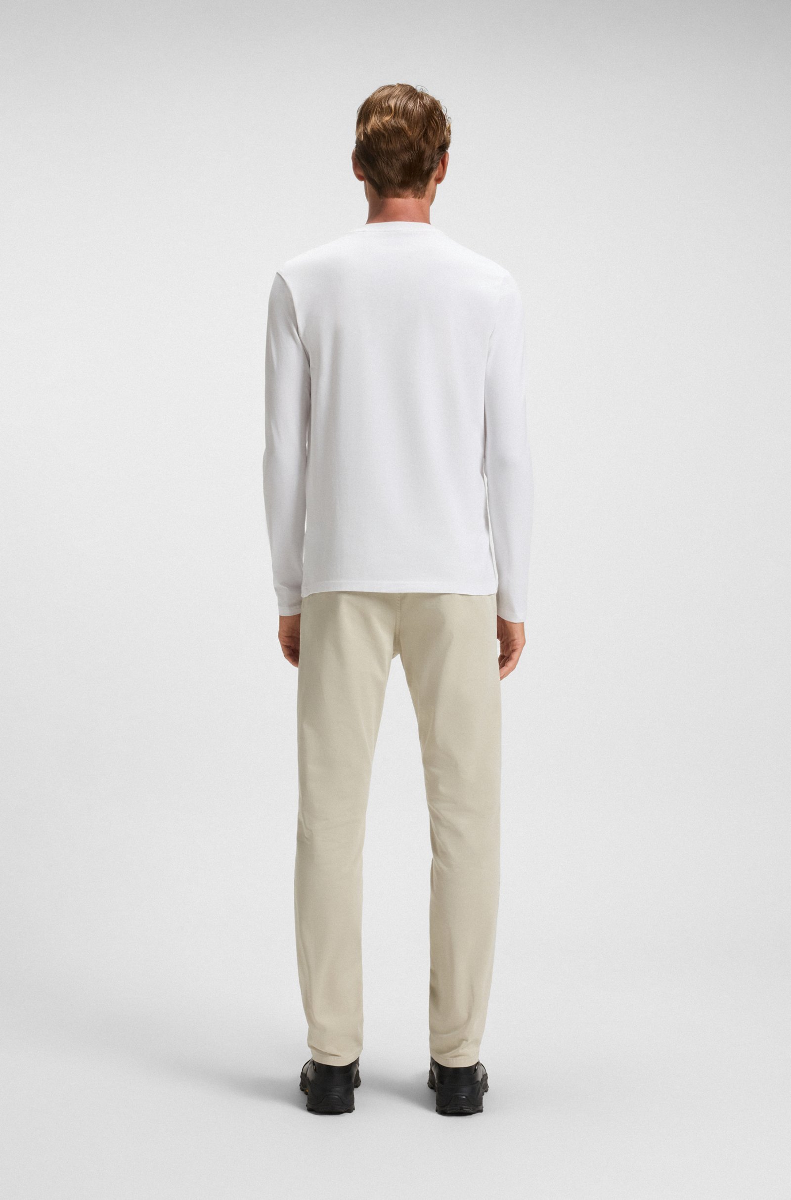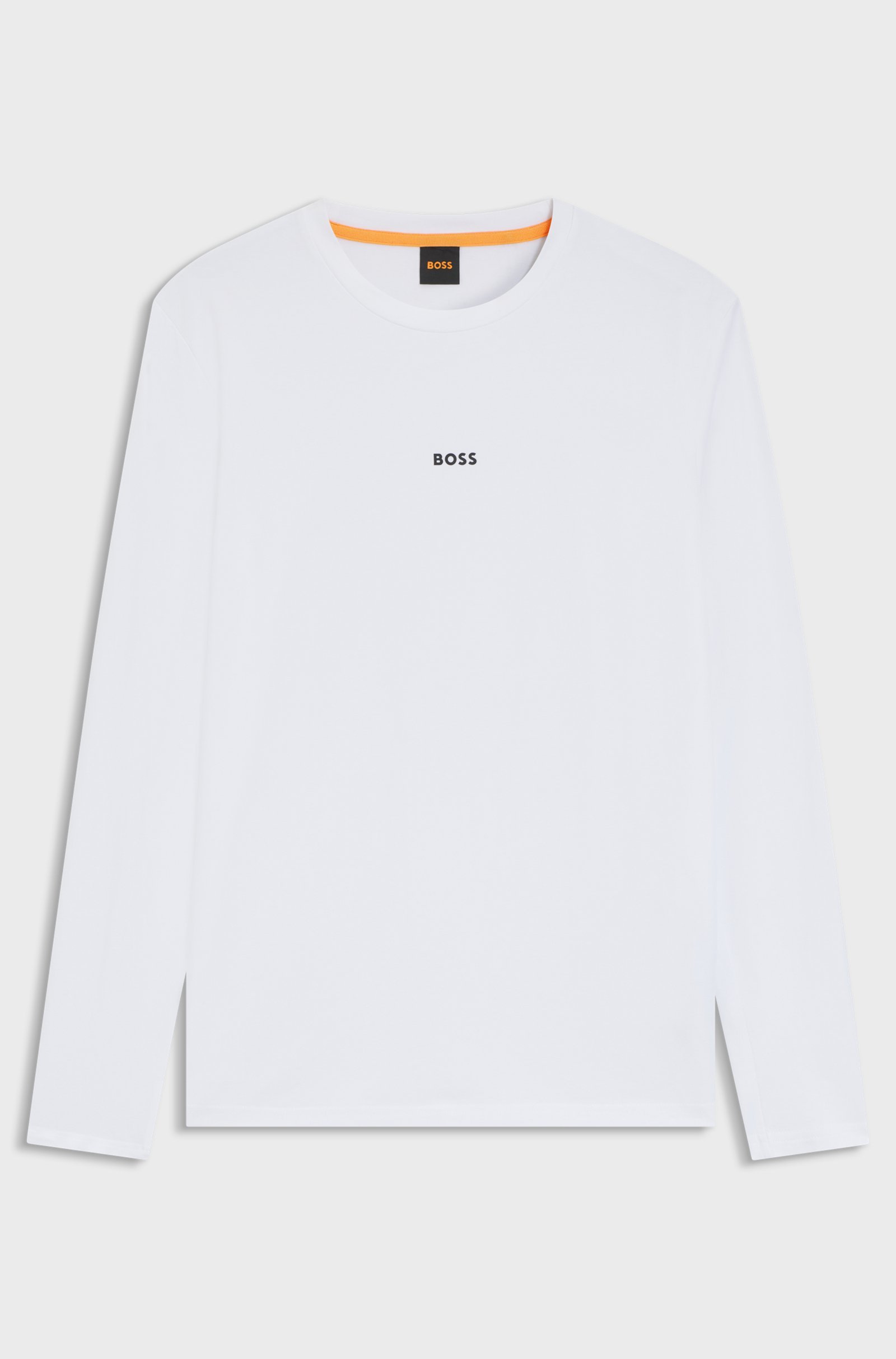 A signature T-shirt by BOSS Menswear. Featuring a seven-layer logo print, this top is cut to a straight fit in cotton blended with stretch.